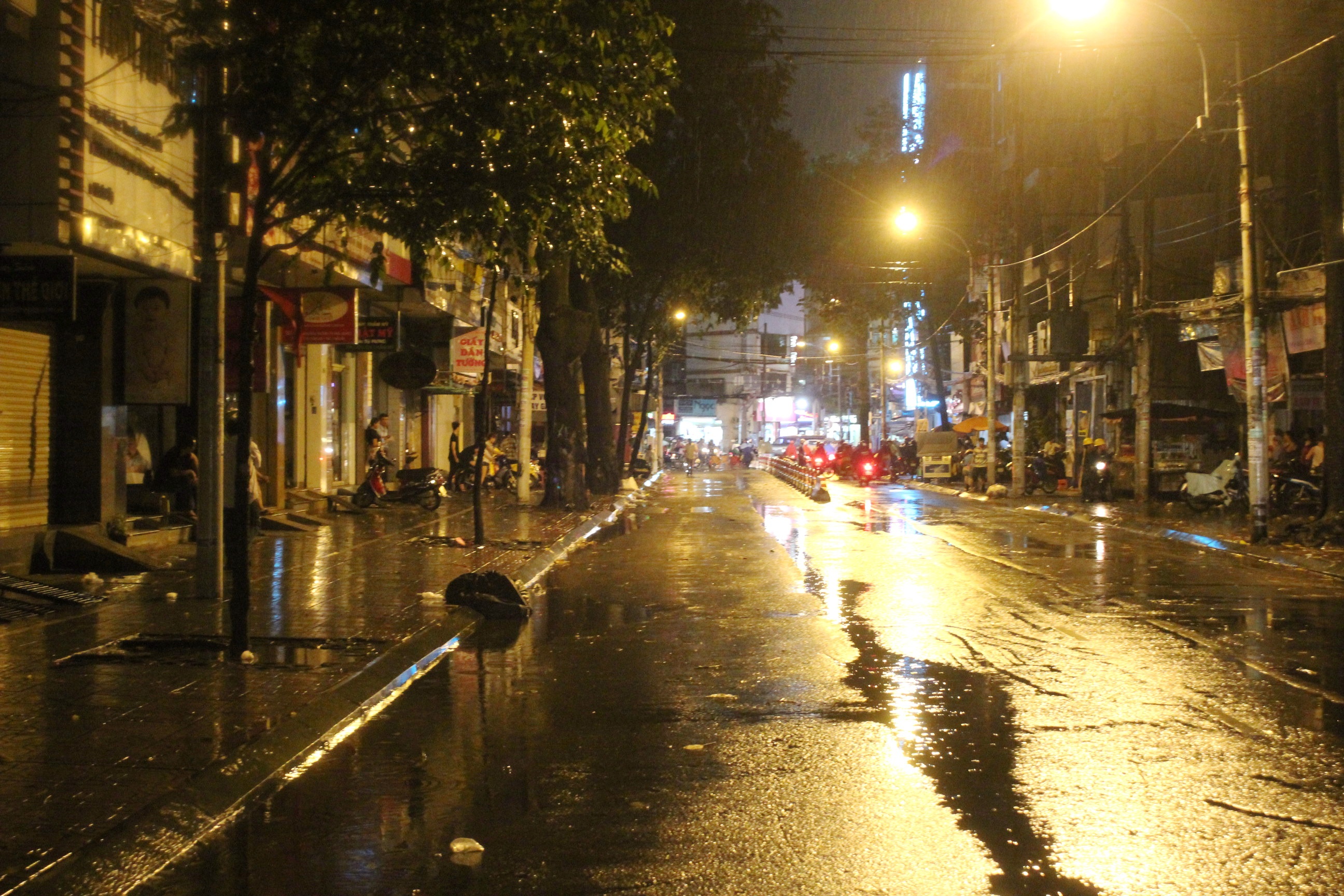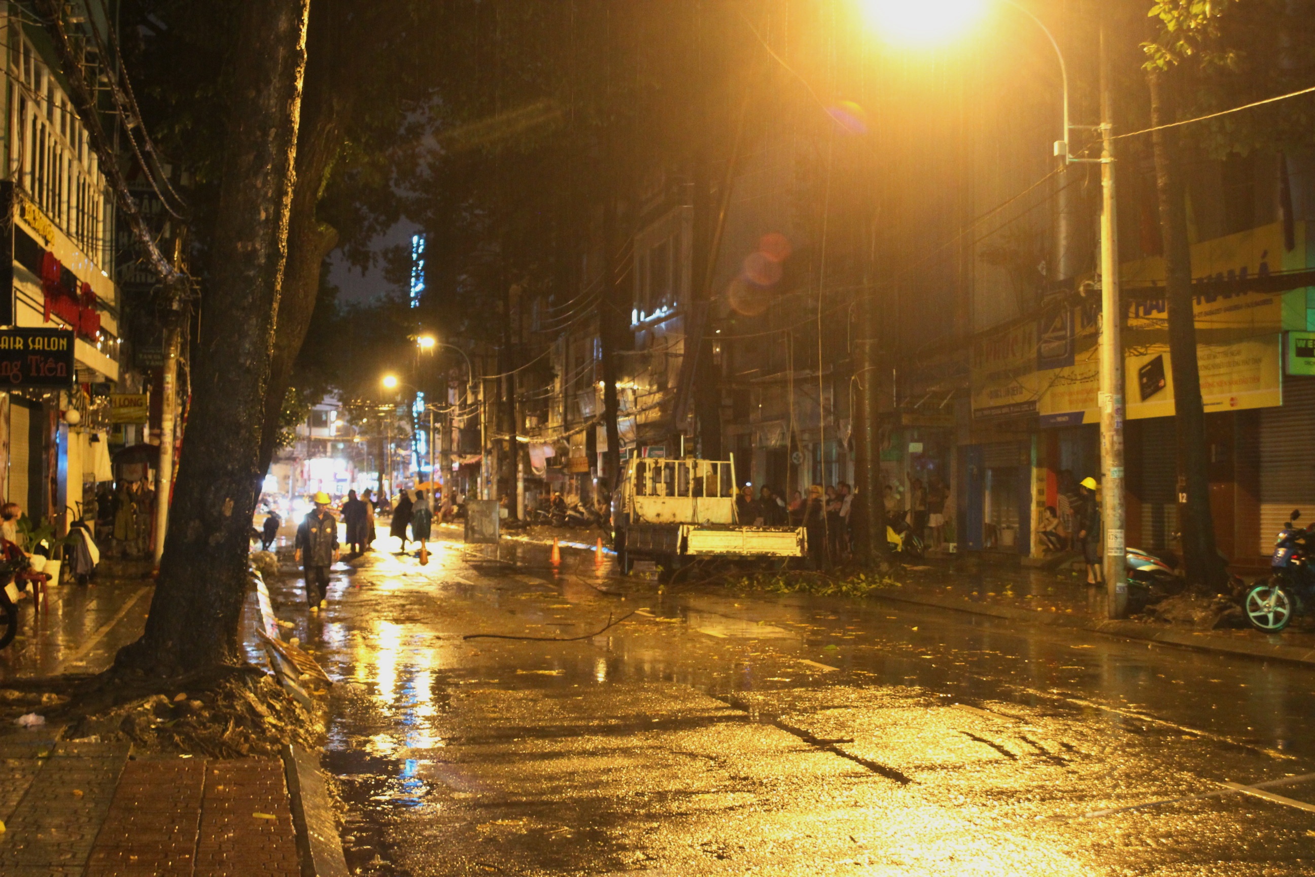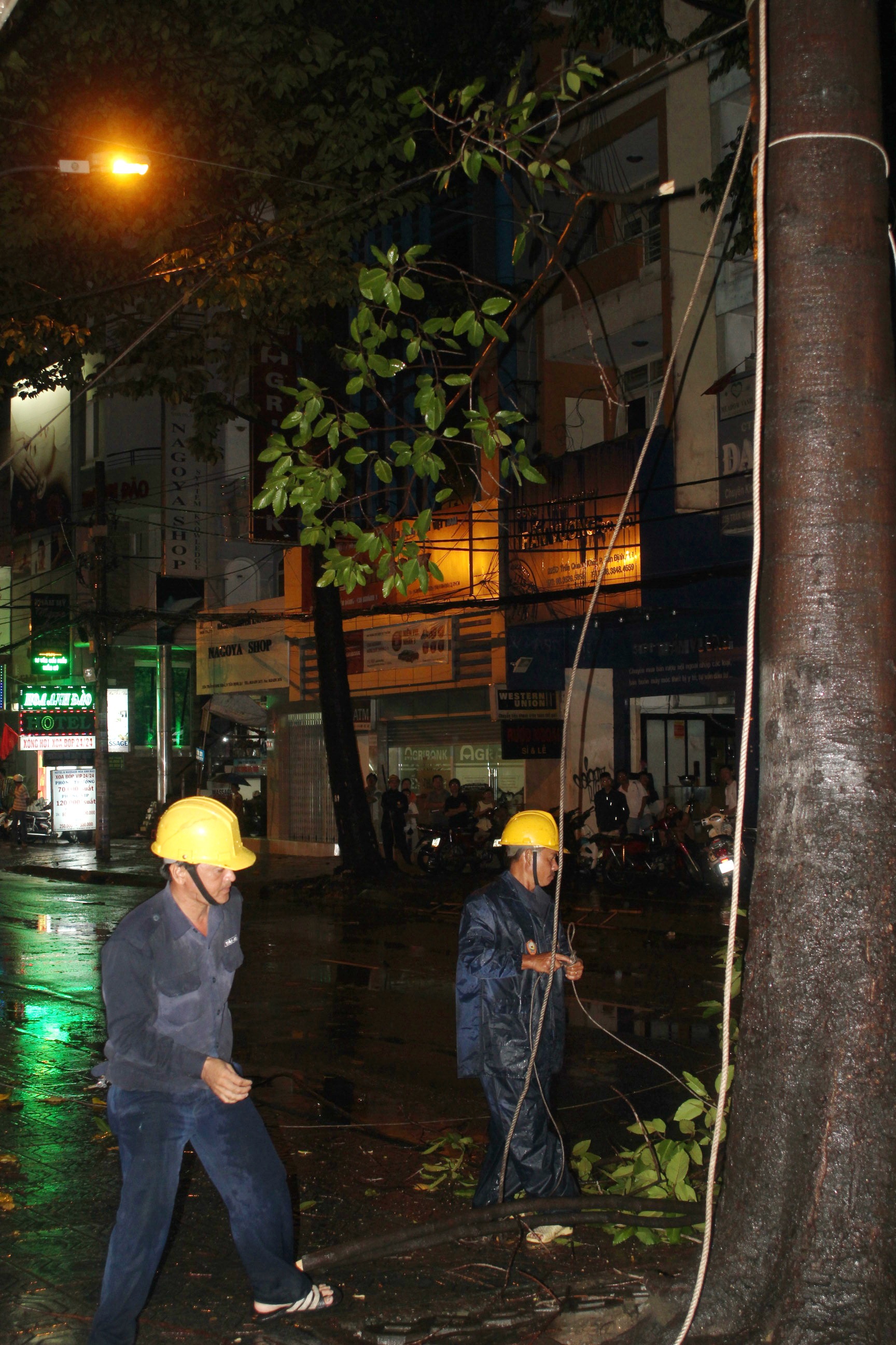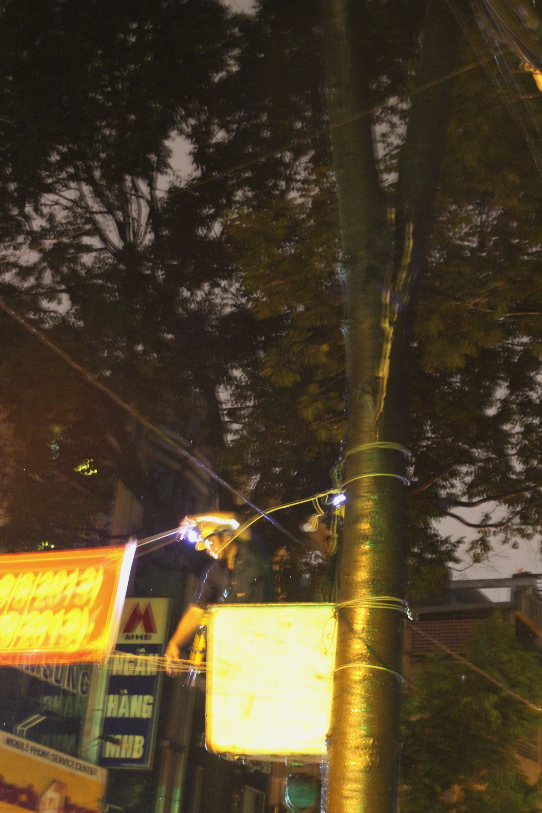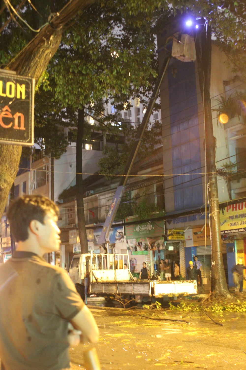 | Từng cành cây lớn nhỏ được hạ xuống an toàn. Đến 20h hơn, công việc đốn hạ cây xanh kết thúc, giao thông được giải tỏa thông suốt |