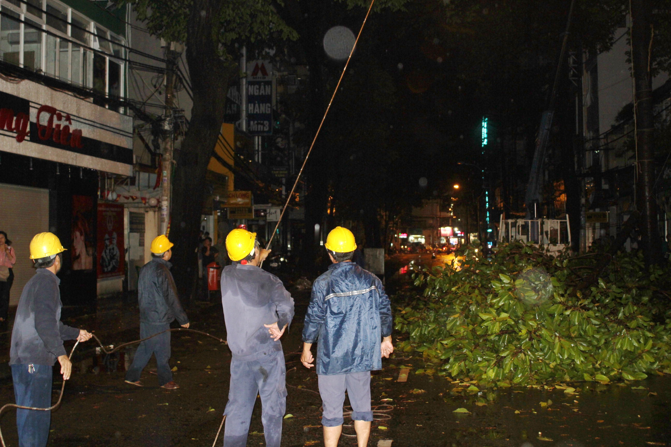 Nhận được tin báo, các công nhân Công ty TNHH MTV Công viên cây xanh tới hiện trường để tiến hành đốn hạ cây.