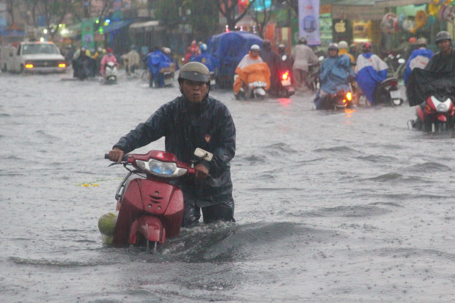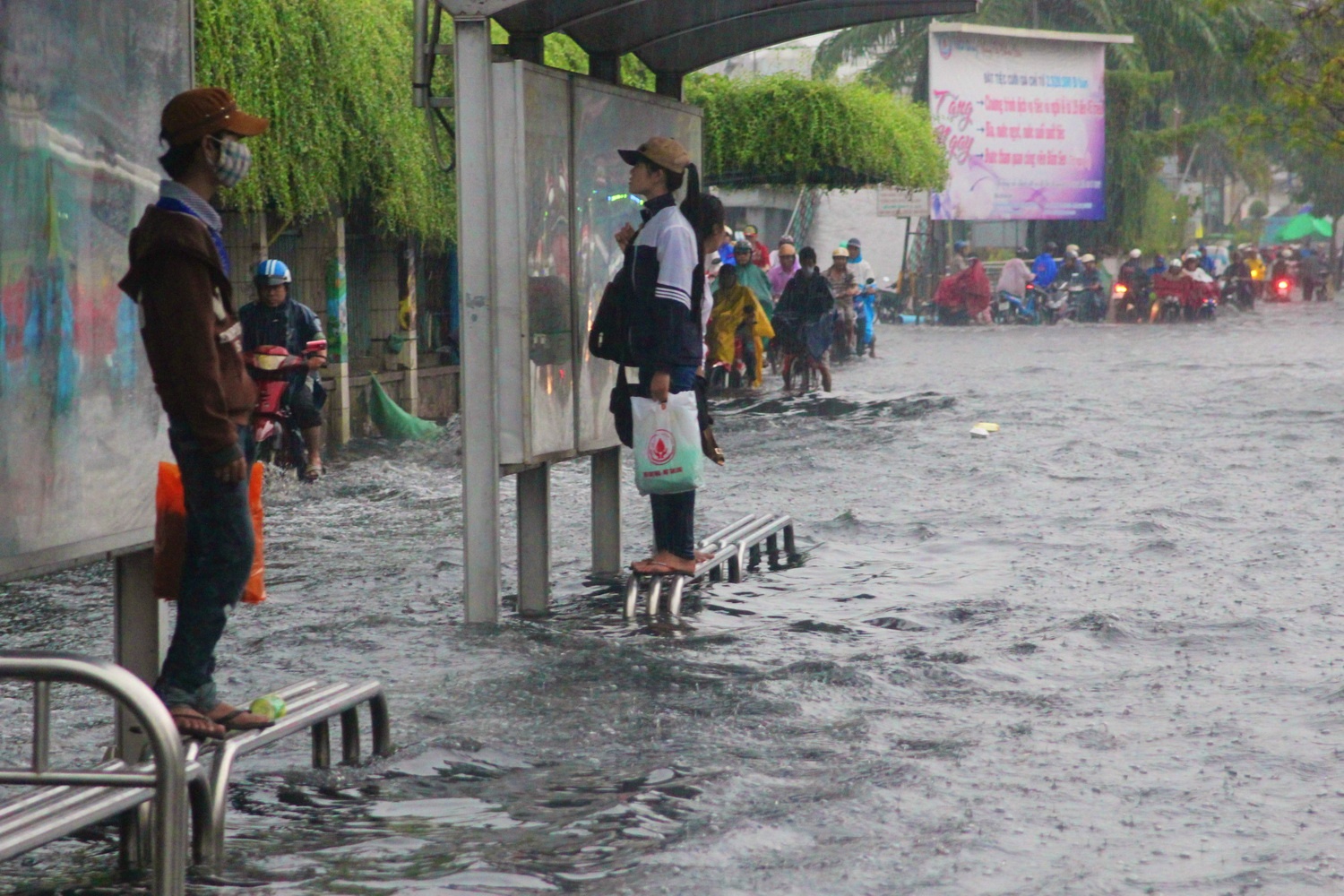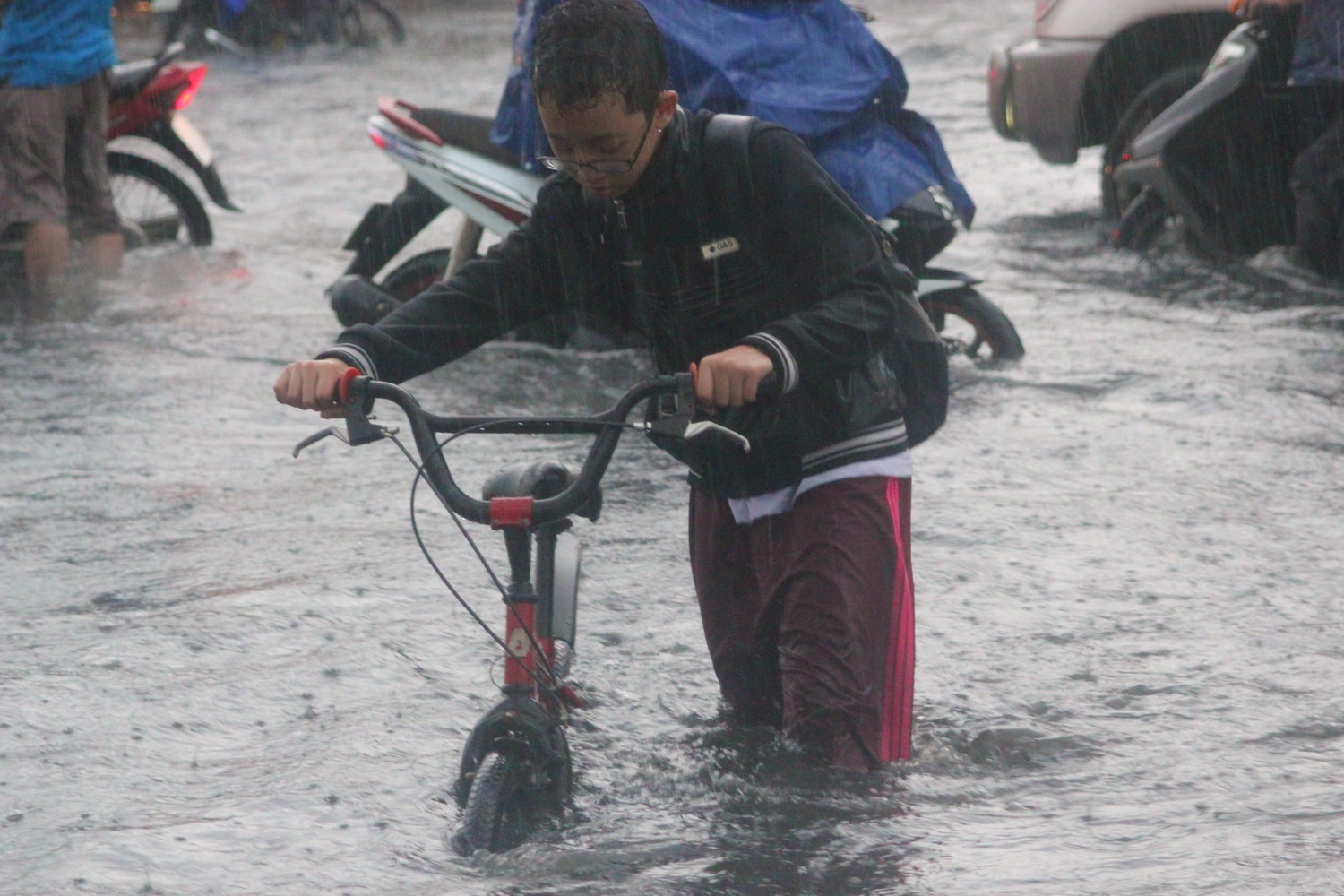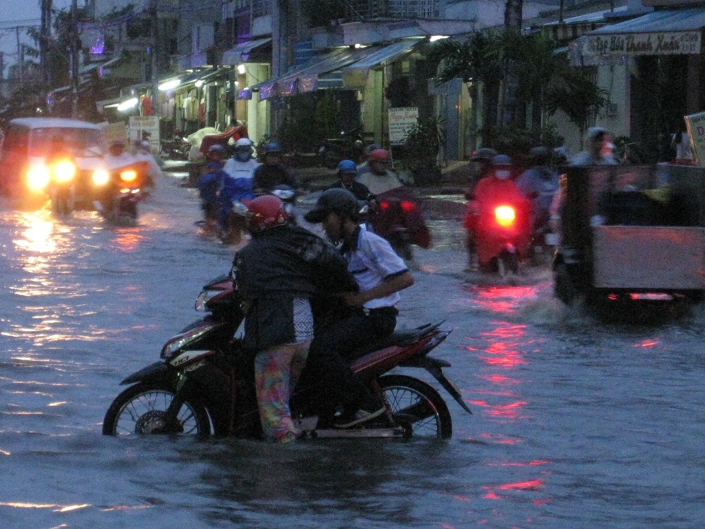 | Đường Tân Hóa cũng bị ngập nửa bánh xe máy |