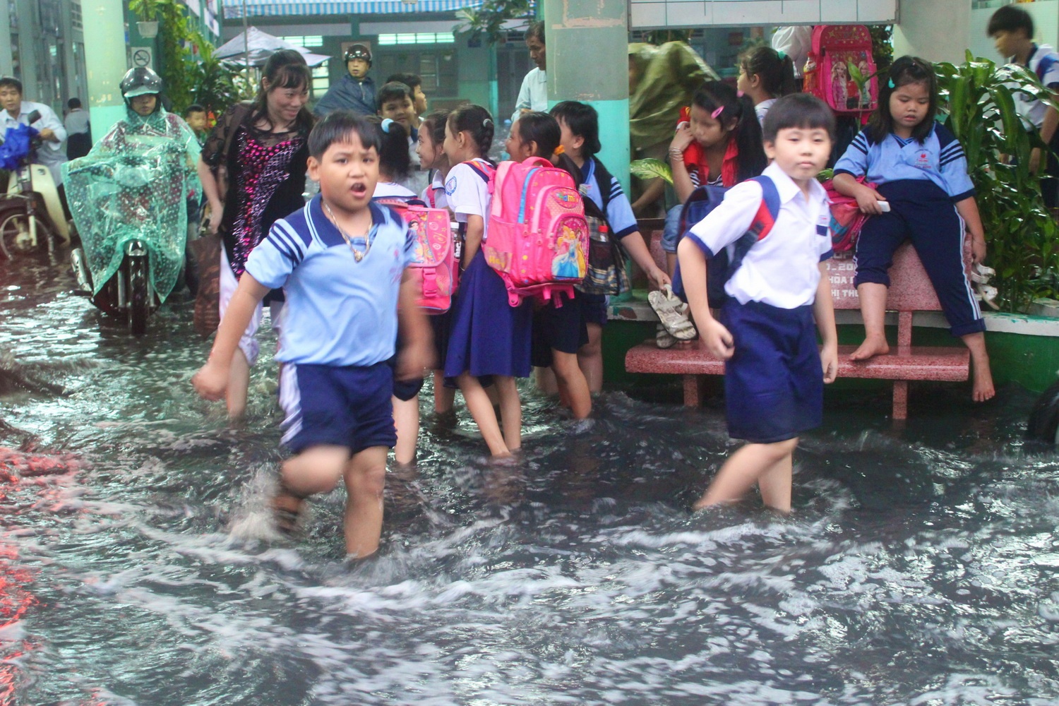 | Thời điểm nước lên ở đường Hòa Bình cũng là lúc học sinh các cấp tan trường, rất nhiều học sinh bì bõm lội và tìm chỗ cao trong trường ngập nước chờ phụ huynh đến đón. |