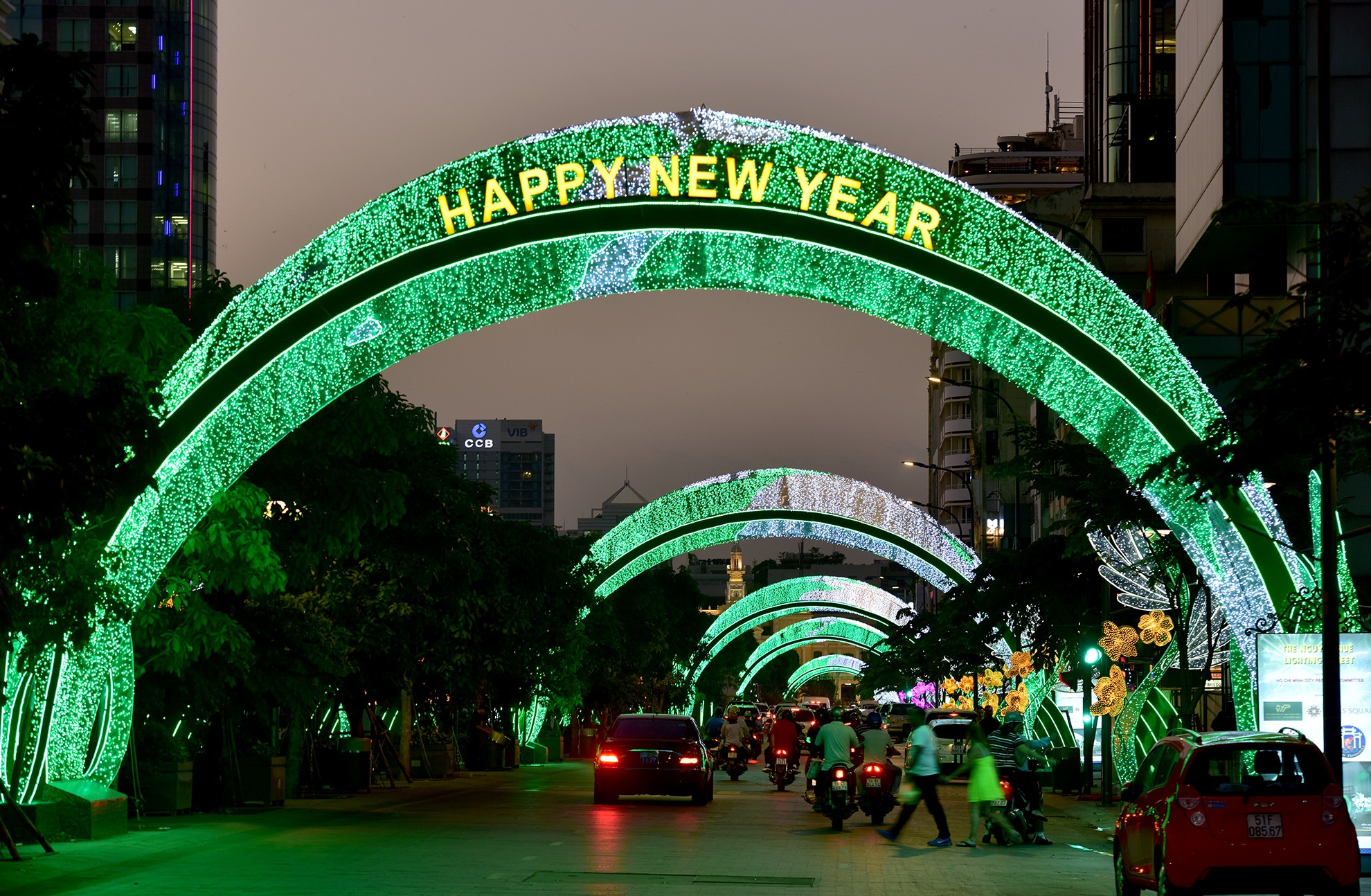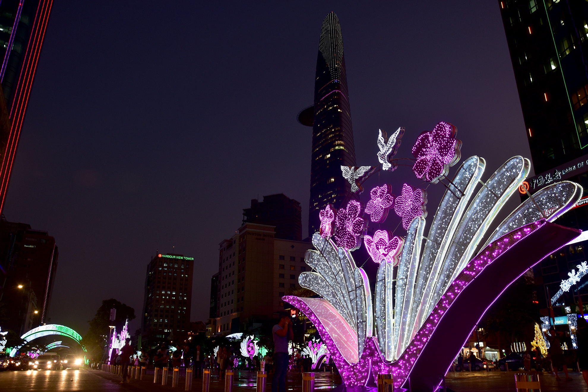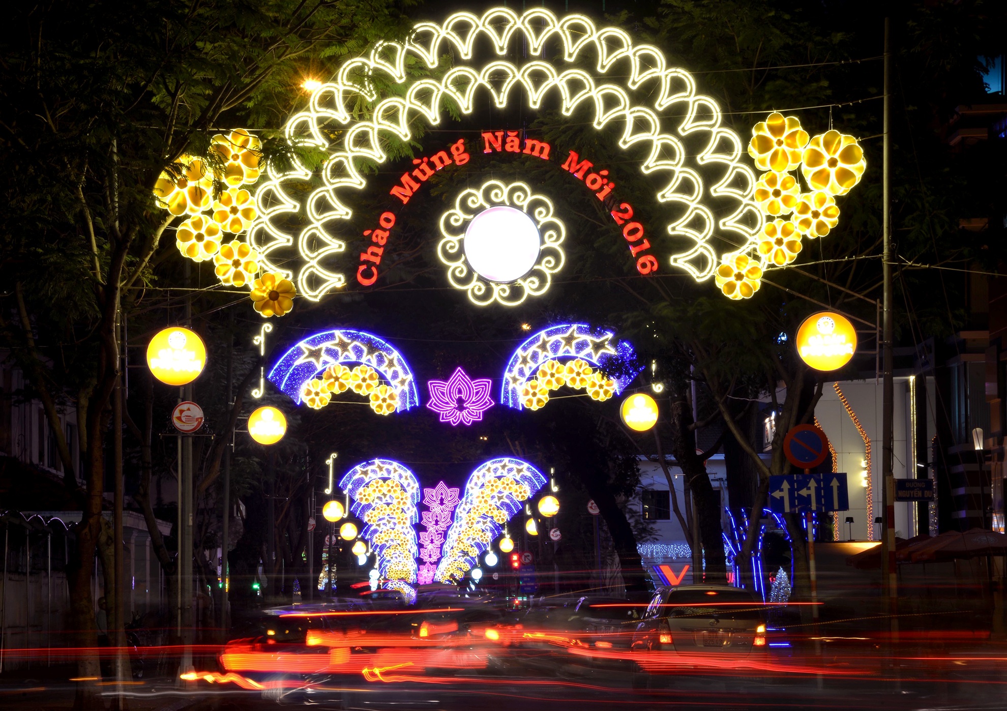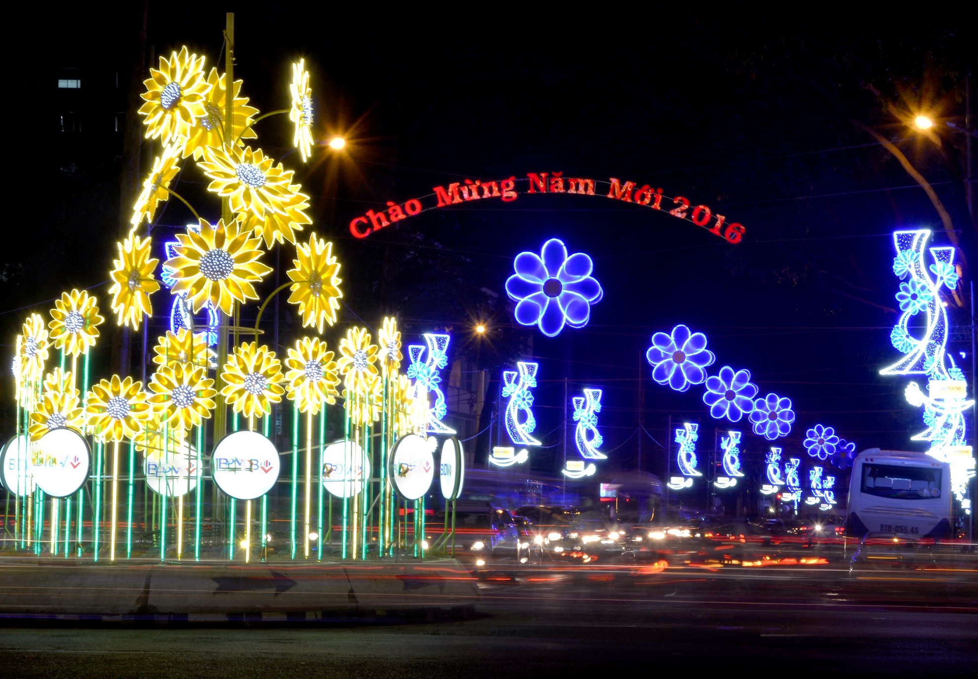 | Những ngày cận kề bước sang năm mới 2016, nhiều tuyến đường trung tâm TP HCM như Trường Sơn, Nguyễn Văn Trỗi, Nam Kỳ Khởi Nghĩa, Lê Duẩn, Phạm Ngọc Thạch, Đồng Khởi, Nguyễn Huệ đã được trang hoàng đèn hoa rực rỡ đầy màu sắc. |