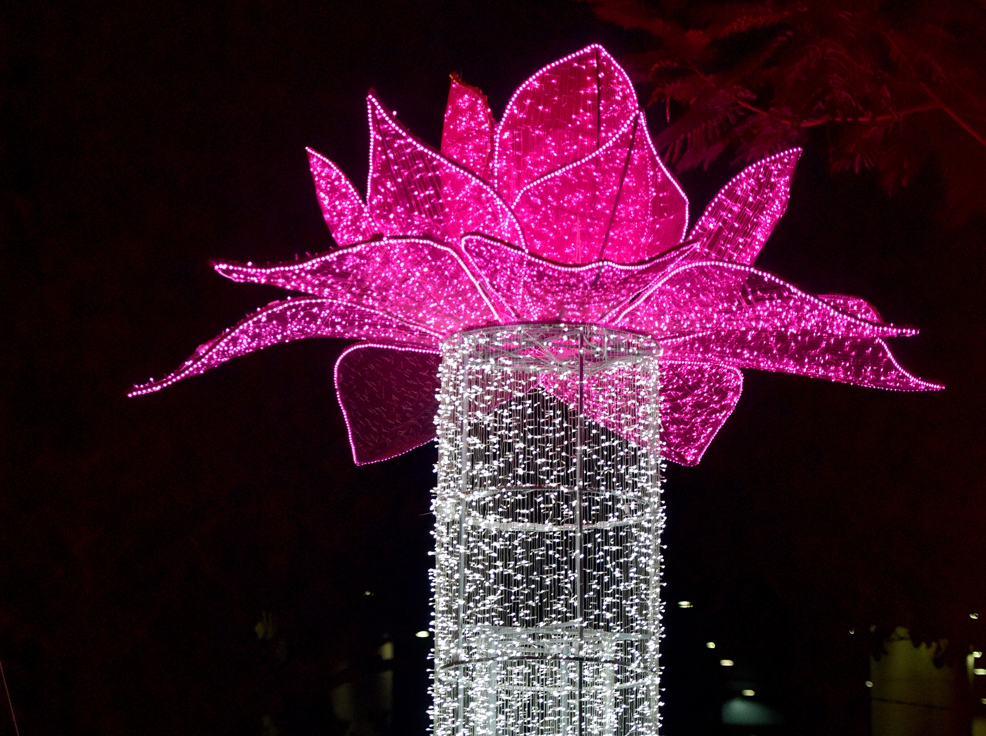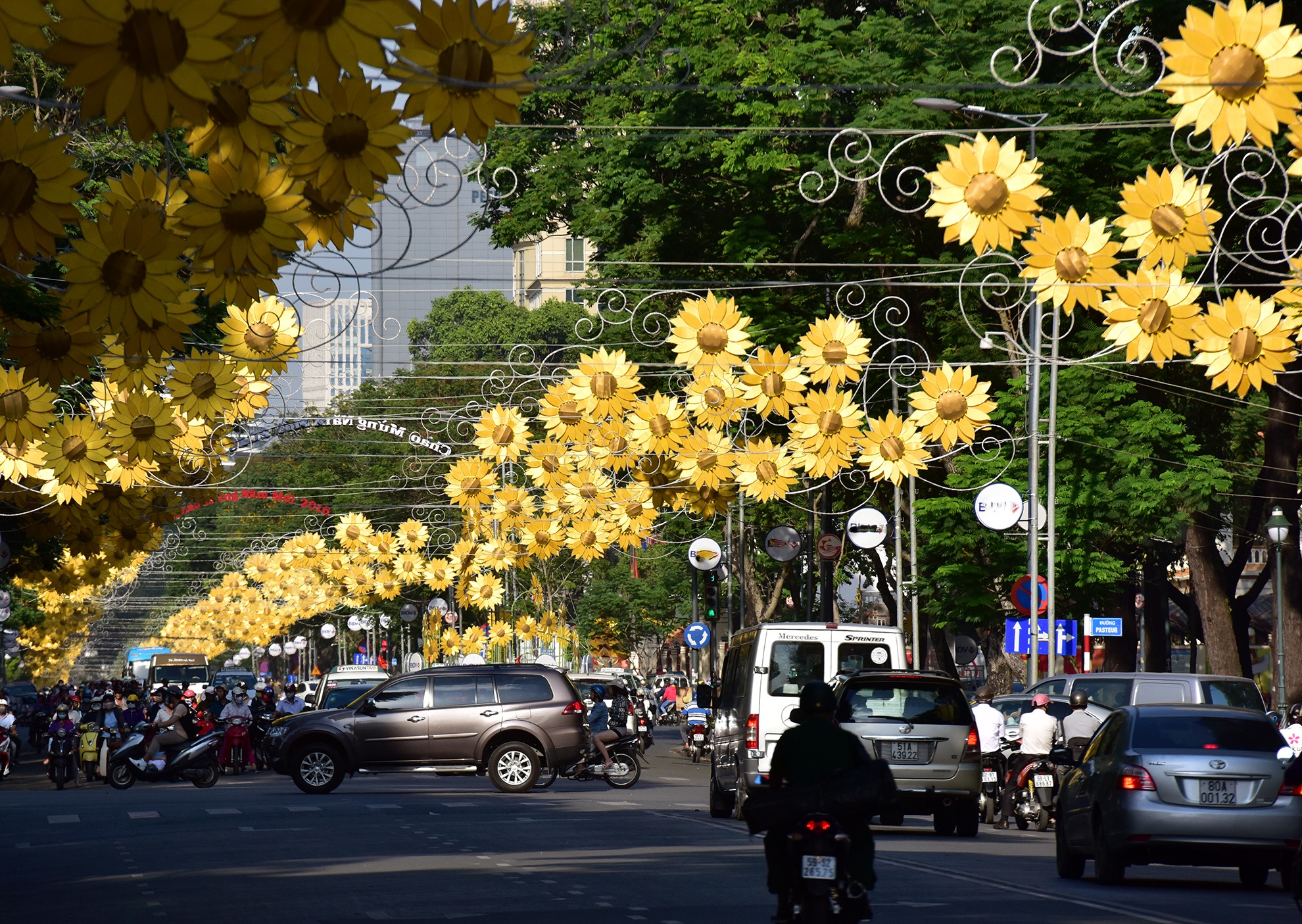 | Đường Lê Duẩn từ dinh Độc Lập tới Thảo Cầm Viên rực ánh đèn vàng qua mô hình những bông hoa hướng dương. |