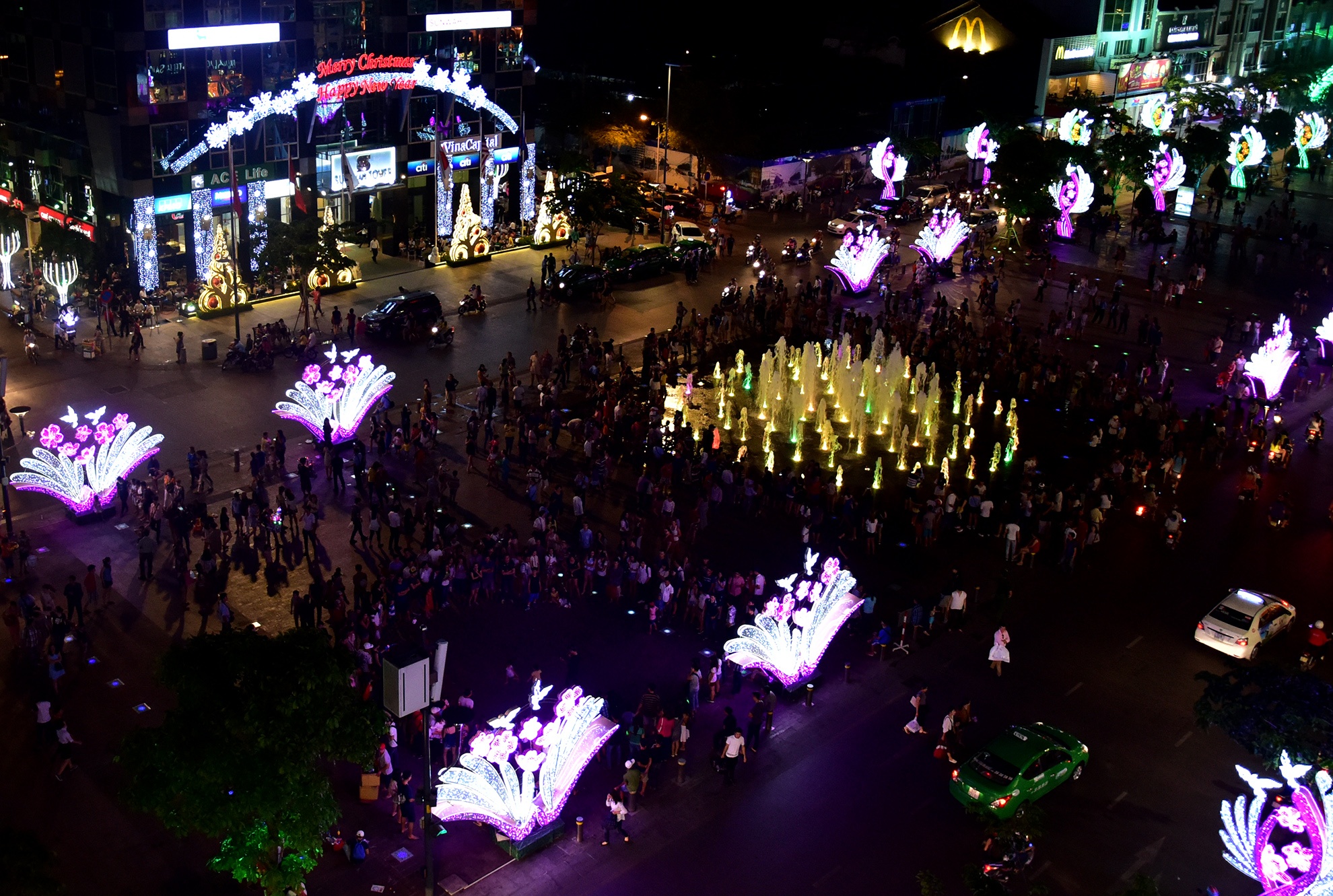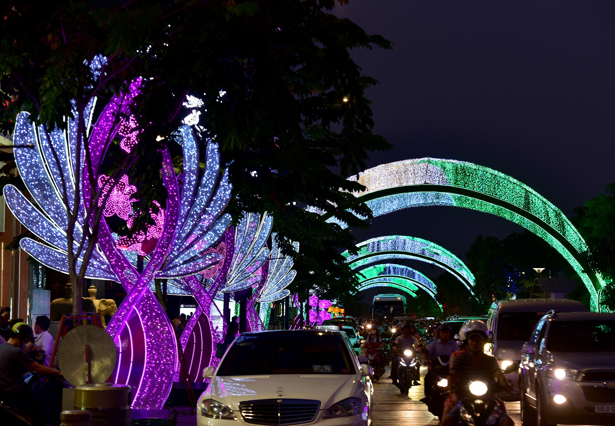 | Buổi tối, các tuyến đường được trang trí rực rỡ sắc màu của ánh đèn nháy. Nổi bật nhất là phố đi bộ Nguyễn Huệ với thiết kế tượng trưng cho những mảnh ghép của quả địa cầu. |