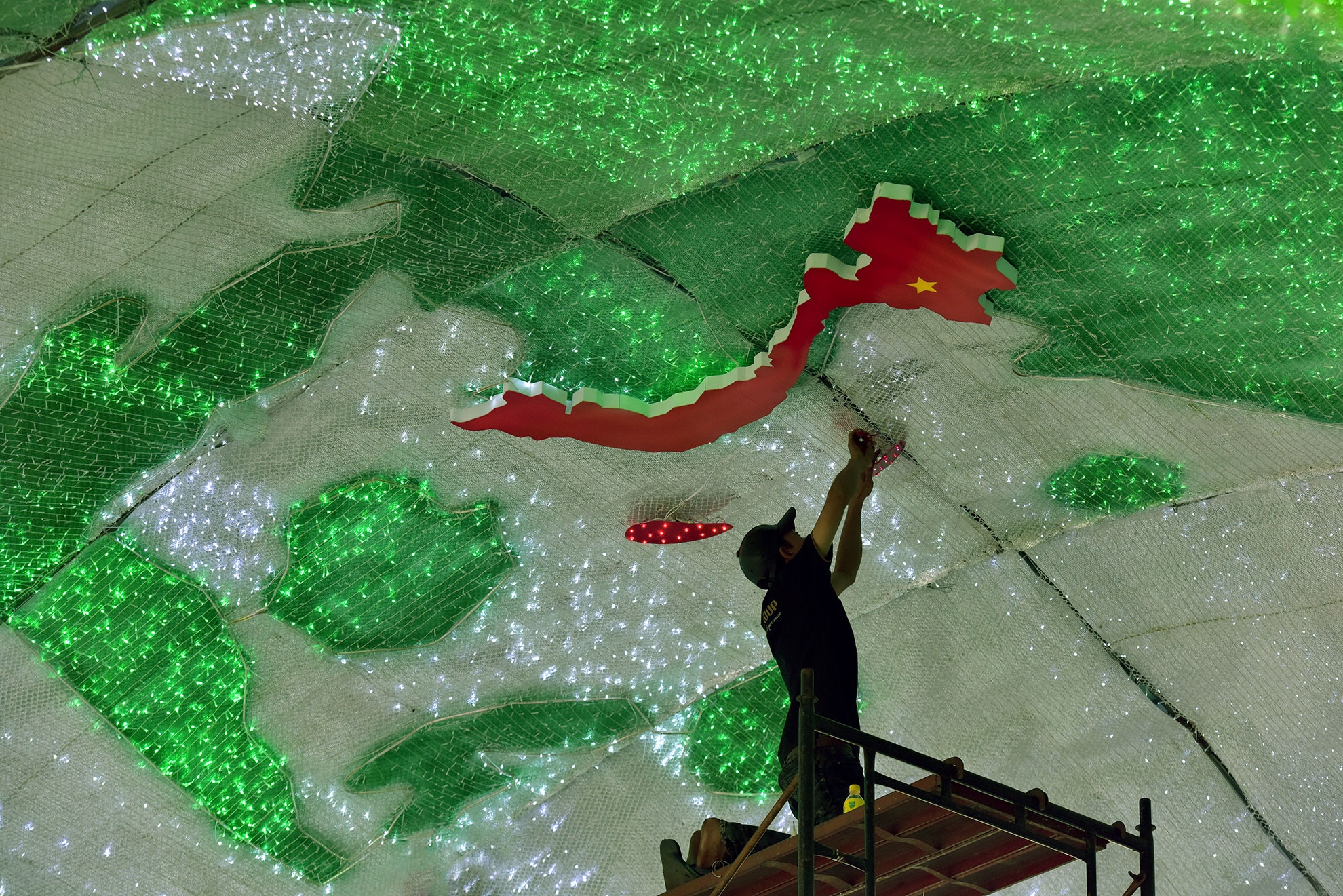 | Trong chiều 30/12, công nhân trang trí những công đoạn cuối cùng để trang hoàng phố đi bộ Nguyễn Huệ. Khu vực này được trang hoàng nhiều màu sắc với những ý nghĩa lớn, kết thúc năm 2015 thành công và những dấu ấn TP HCM. |