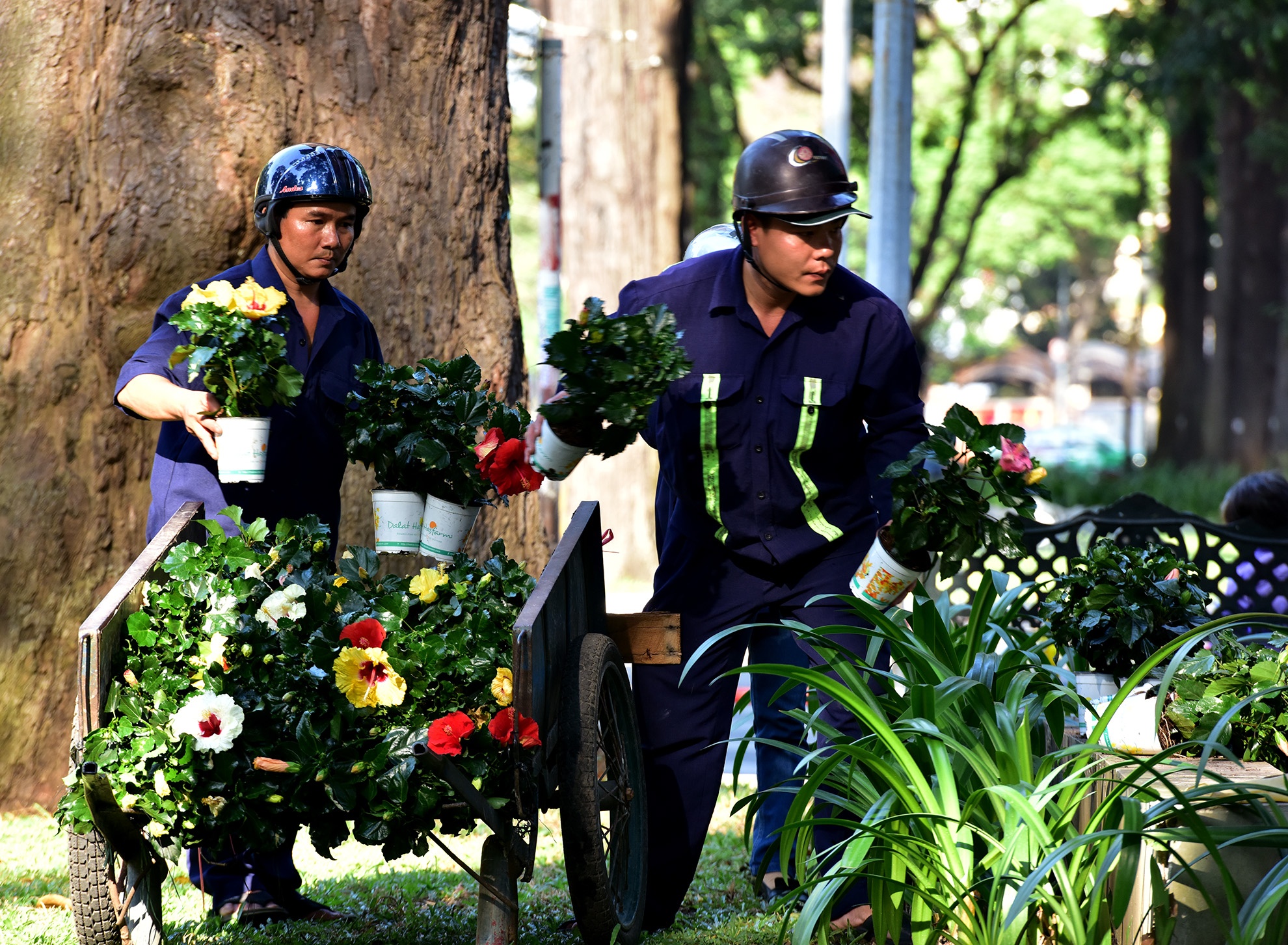 | Tại các công viên trung tâm TP, công nhân Công ty công viên cây xanh hối hả chở xe hoa tươi mới đến trưng bày. |