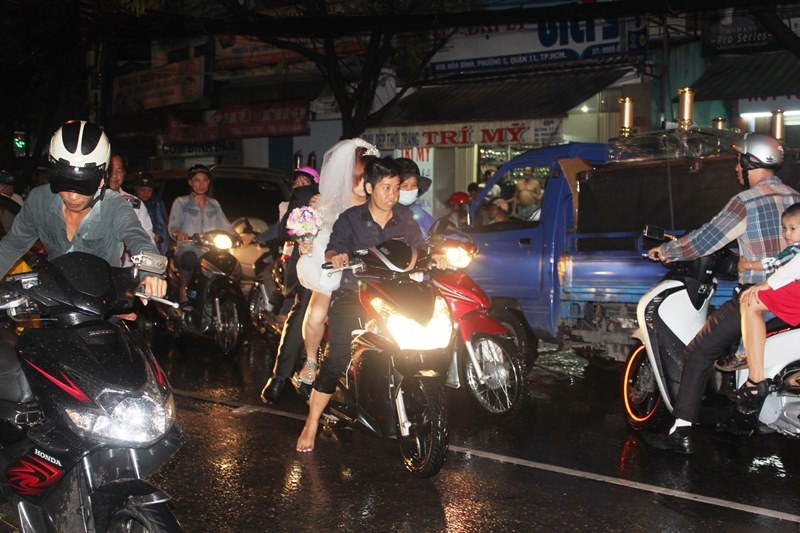 Sài Gòn ngập lụt, cô dâu chú rể thuê xe ôm đến lễ cưới