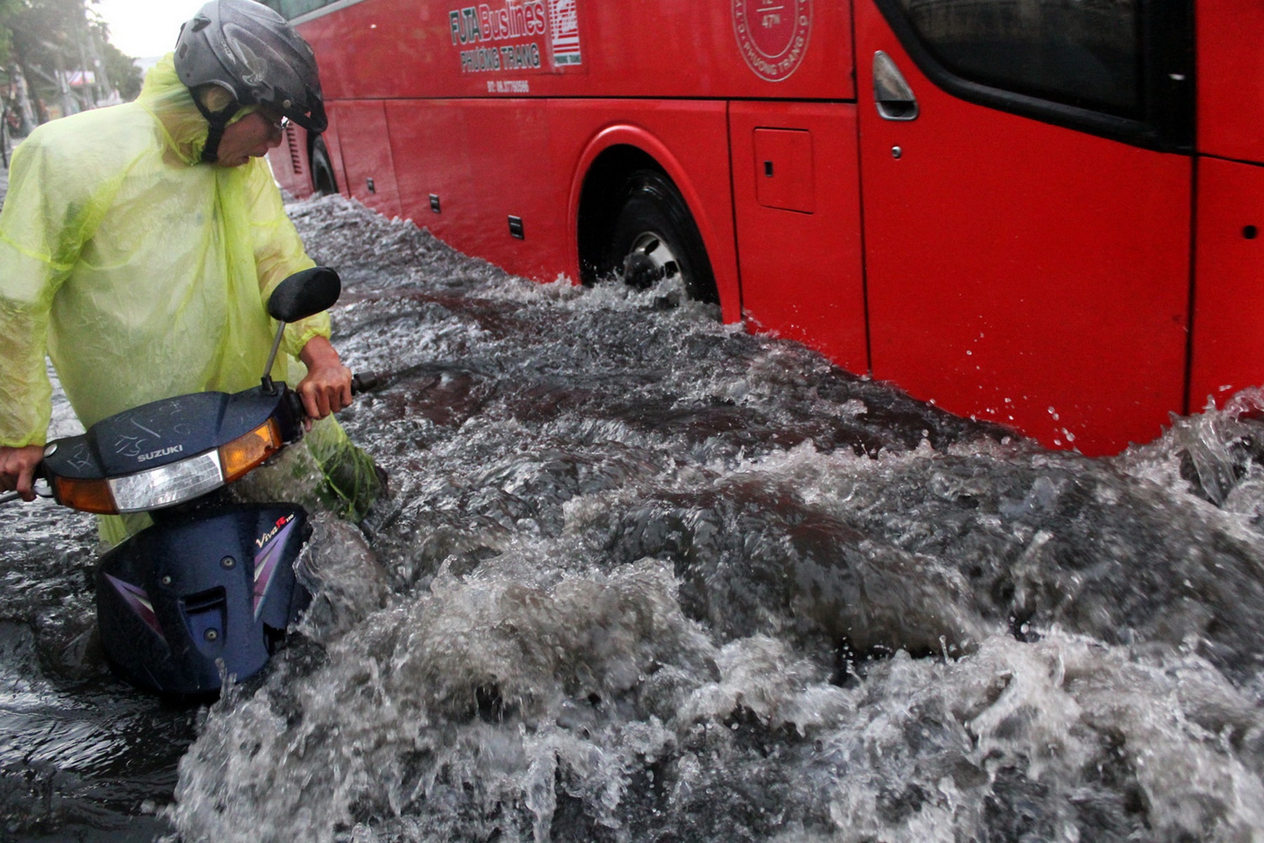 | Nước ngập đến bậc lên xuống của xe buýt. |