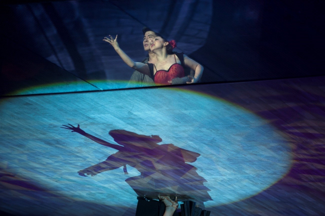 Ảnh phản chiếu chân dung 2 vận động viên Trung Quốc trong đêm chung kết cuộc thi Bước nhảy hoàn vũ.