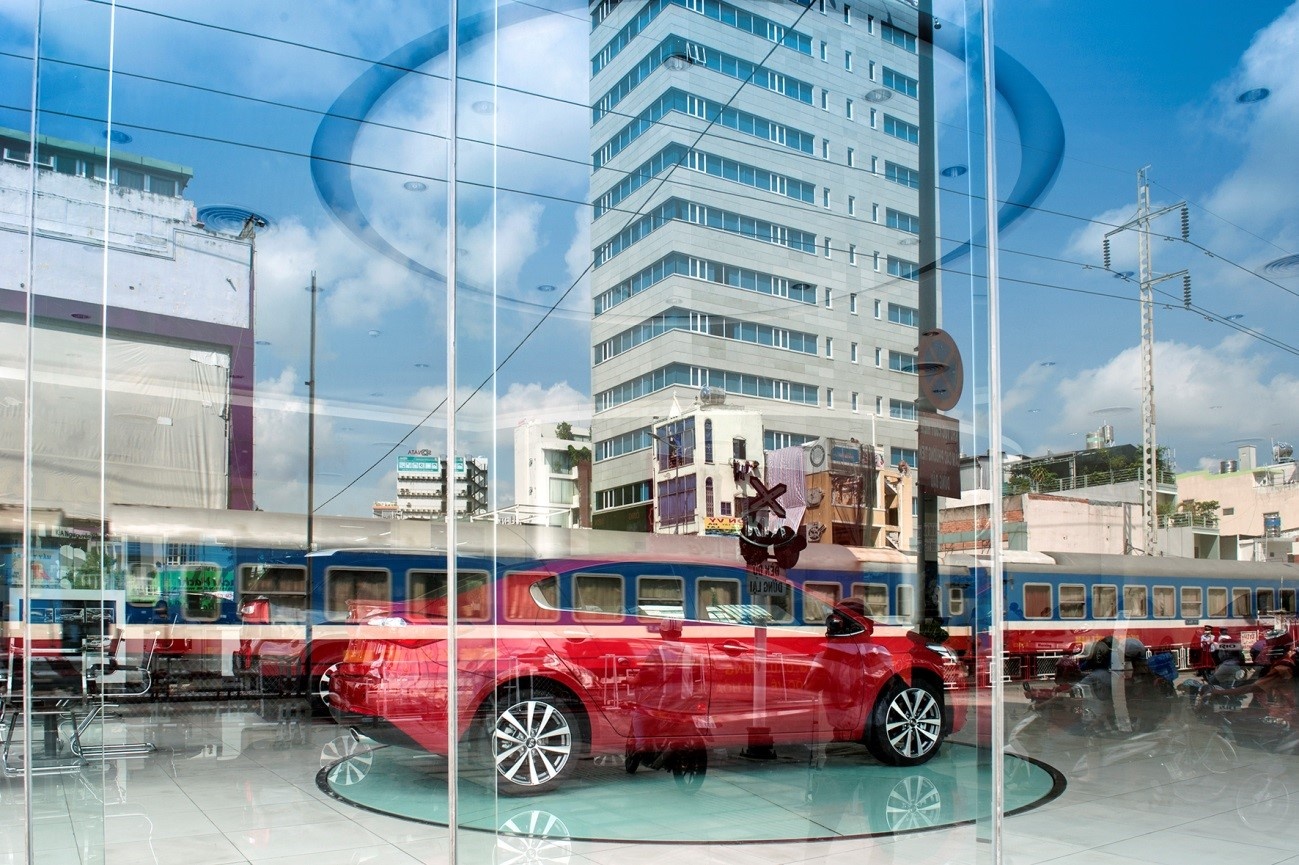 Nhờ sự phản chiếu từ vách kính của salon xe hơi, các phương tiện khác như xe lửa, xe gắn máy được hòa trộn, miêu tả bức tranh giao thông rất đặc trưng của Sài Gòn.