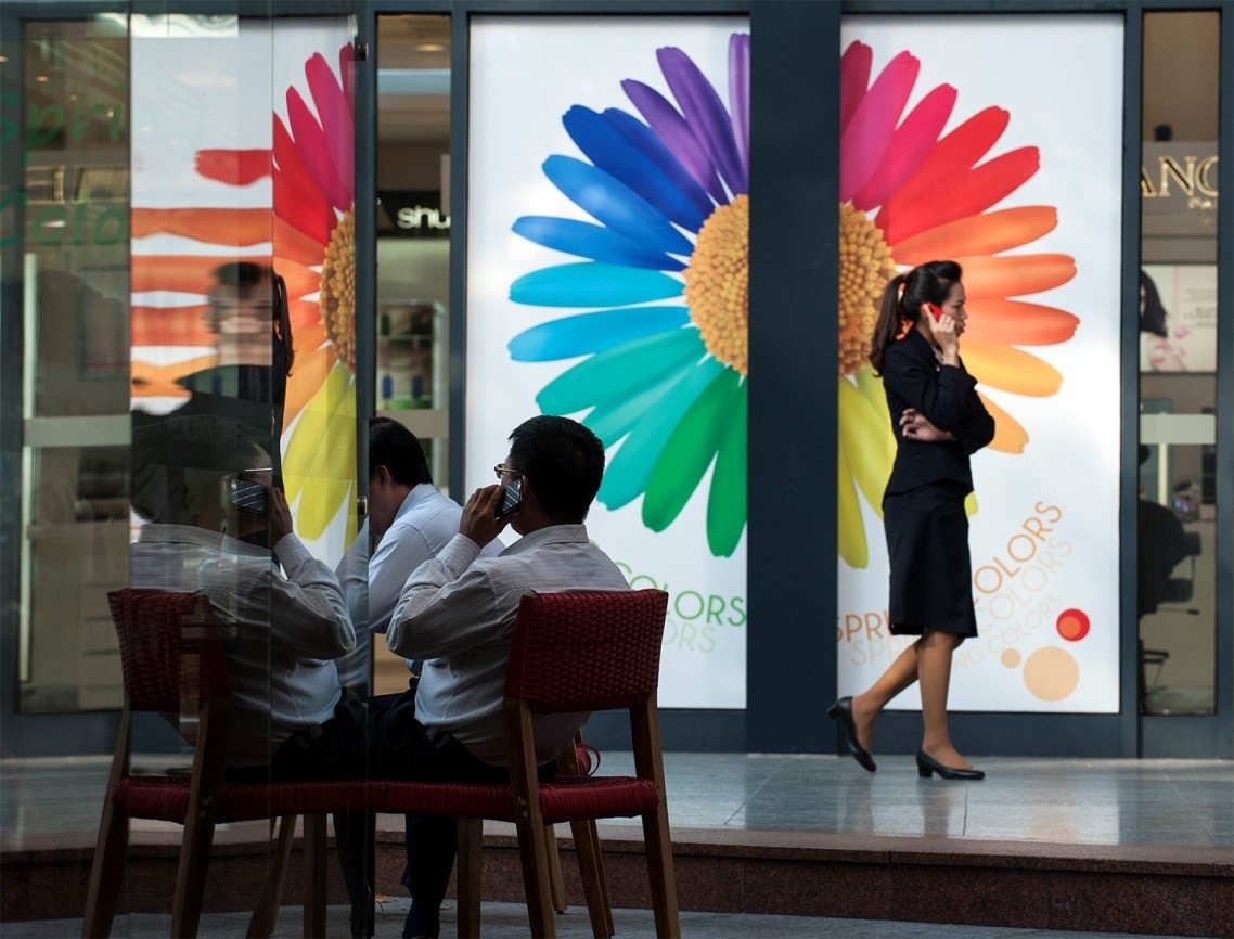 Người ngồi, người đang đi, cả 2 đều bận rộn với công việc qua chiếc điện thoại của mình. Bức ảnh phản ánh một Sài Gòn với cuộc sống văn minh và năng động.