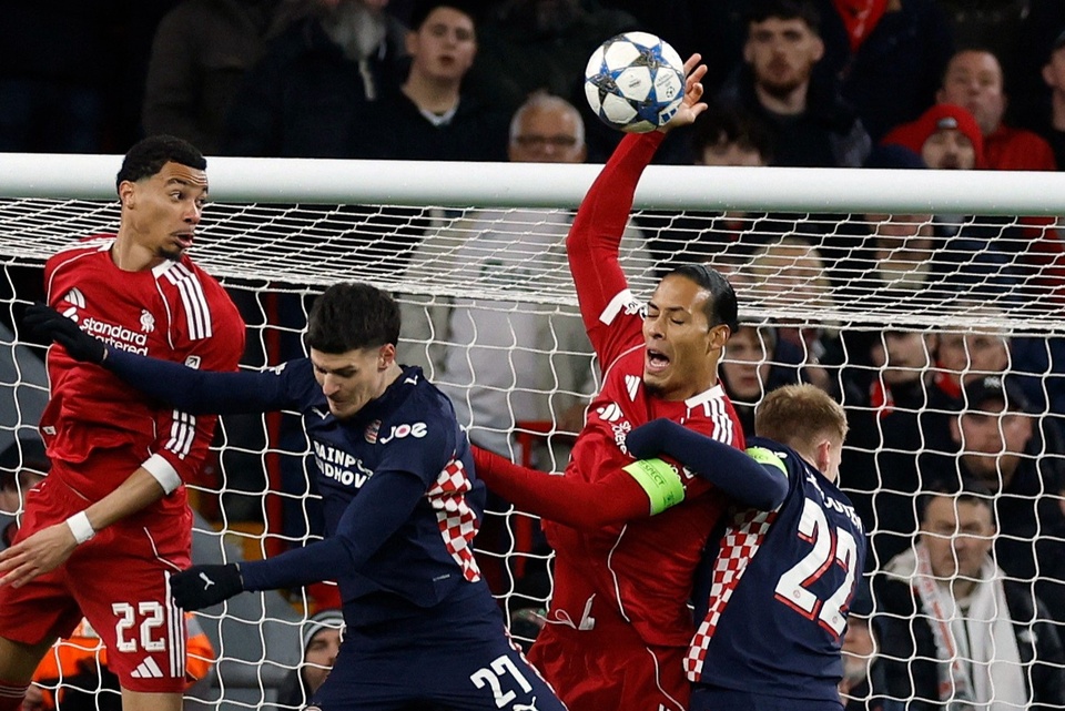 Ngay phút thứ 5, từ một tình huống cố định, Van Dijk bất ngờ giơ tay lên cao và để bóng chạm vào. Khoảnh khắc xử lý kỳ lạ này khiến trọng tài lập tức thổi phạt đền cho PSV. Cựu sao Tottenham, Ivan Perisic, dứt điểm đánh bại Alisson để mở tỷ số trận đấu.