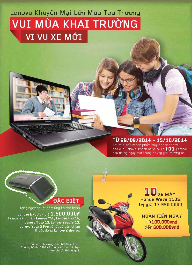 Trong thời gian diễn ra chương trình, khi mua bất cứ dòng sản phẩm máy tính xách tay nào của Lenovo, khách hàng sẽ có cơ hội cào trúng ngay một trong những giải thưởng giá trị: 10 chiếc xe máy Honda Wave hoặc trừ ngay 100.000 - 600.000 đồng vào giá sản phẩm (tổng cộng có 20.000 giải).