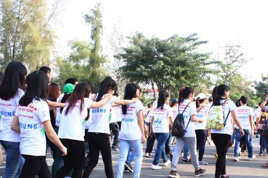 | Các bạn trẻ nhận áo từ đơn vị tài trợ chính Samsung và tham gia đi bộ vì một Việt Nam tốt đẹp hơn. |