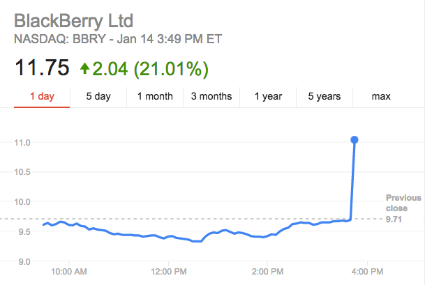 | Giá trị cổ phiếu của BlackBerry tăng vọt sau khi thông tin về vụ sáp nhập được Reuters đăng tải. |