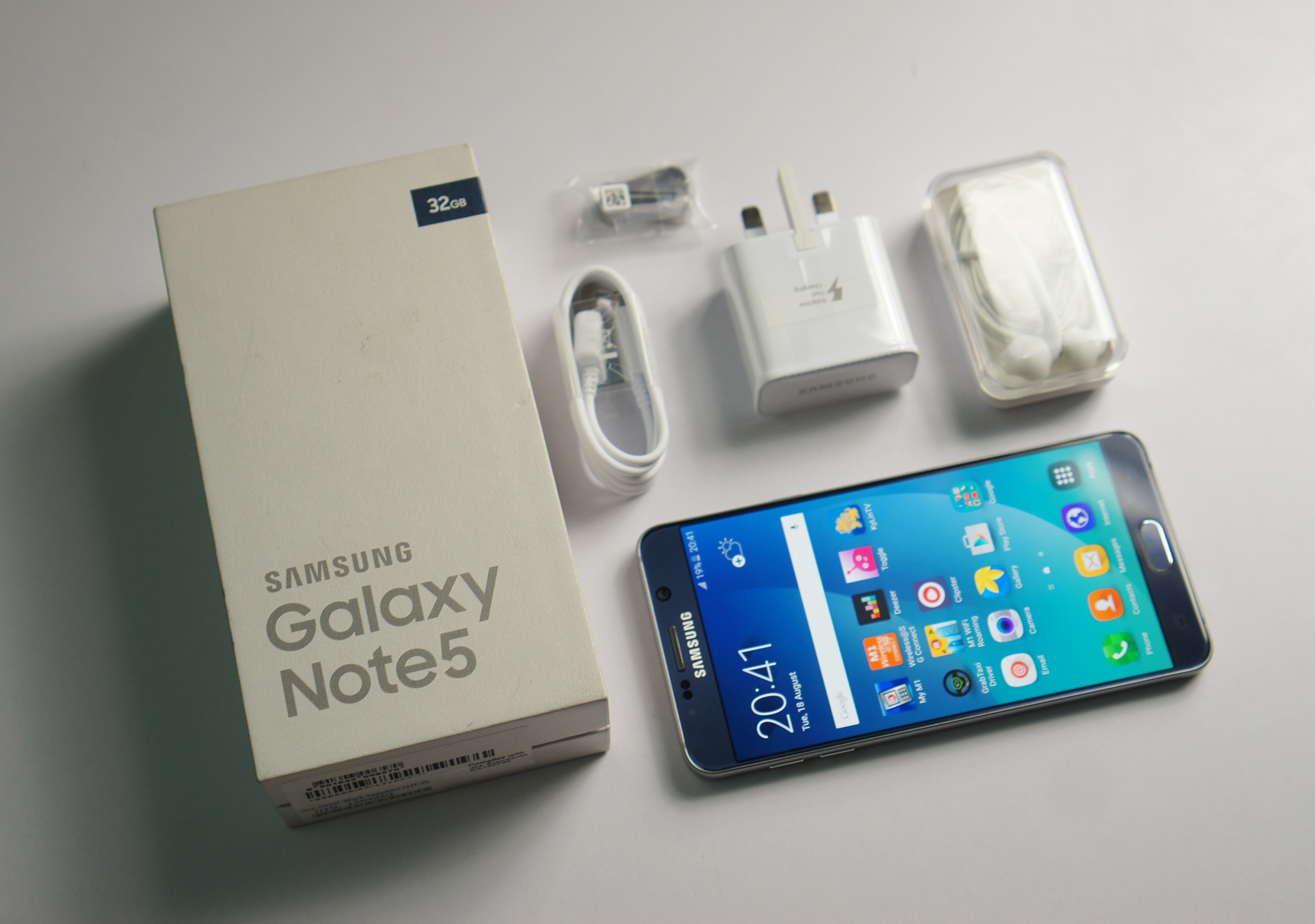 | Phụ kiện đi kèm với máy gồm có hộp đựng, sạc, cáp, tai nghe, đầu bút S Pen, sách hướng dẫn. Chiếc Note 5 vừa về Việt Nam là bản 32 GB. |