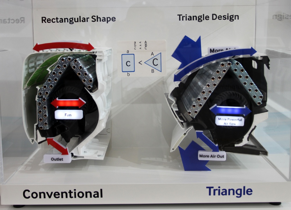 Với thiết kế tam diện (triangle design), AR9000 cho phép nới rộng hơn kích thước của cửa hút, cửa phân phối khí lạnh và quạt nhưng vẫn giữ được kích thước thân máy nhỏ gọn để nâng cao trải nghiệm điều hòa không khí tổng thể.