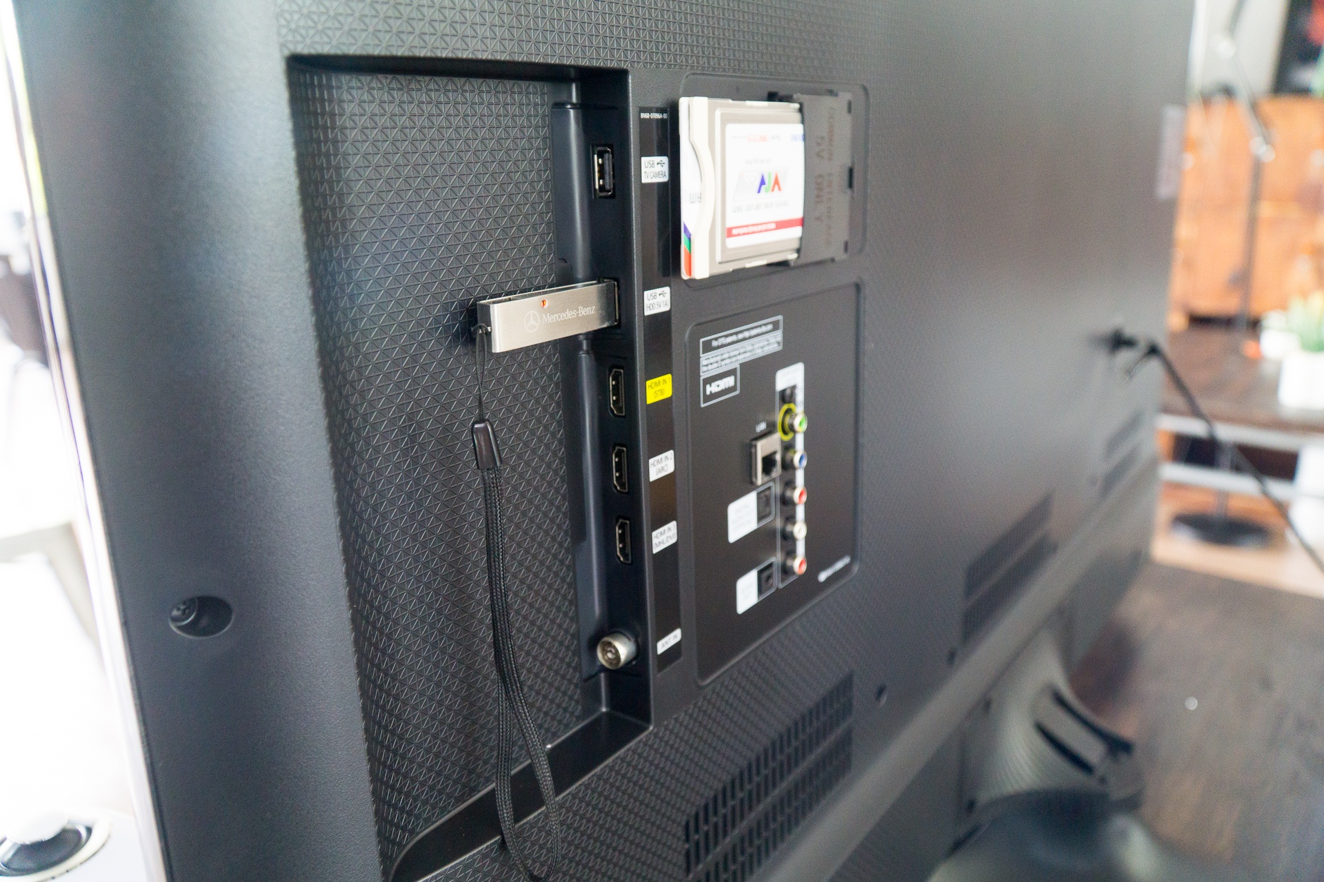 | Thẻ CAM có thể lắp gọn ở mặt sau. J5520 có nhiều cổng kết nối HDMI, USB, analog,... nhưng có thêm Bluetooth để kết nối không dây với các thiết bị ngoại vi. |
