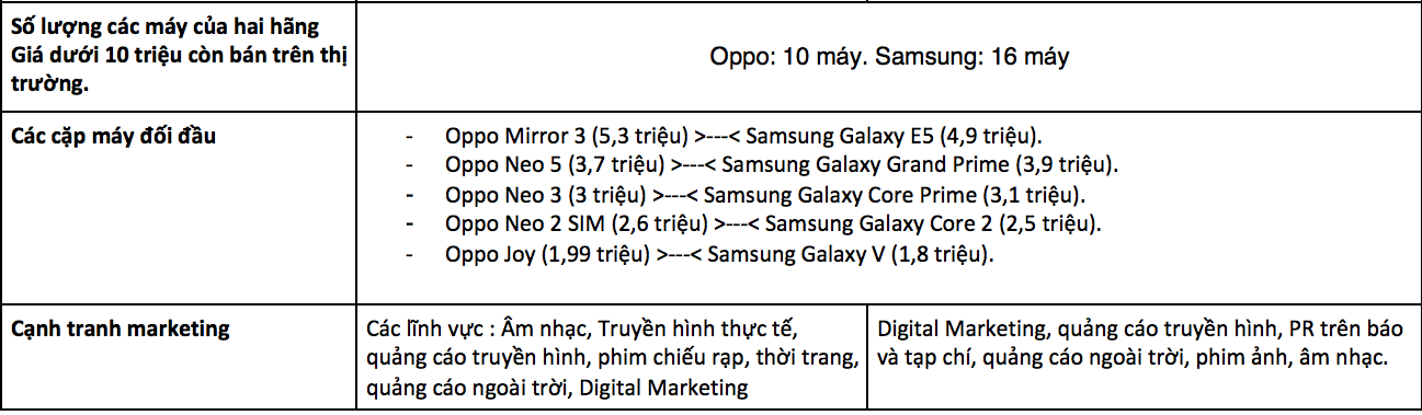 Trong quý I/2015, Samsung đã thành công khi điều chỉnh giá tốt cho hàng loạt sản phẩm dưới 10 triệu đồng, từ những mẫu giá rẻ như Galaxy V, Galaxy Core Prime cho đến những mẫu cận cao cấp thuộc dòng Galaxy A, mẫu tầm tung Galaxy E. Trong khi đó, Oppo lại đẩy mạnh việc cho ra mắt sản phẩm mới, hướng đến giới trẻ và quảng bá mạnh mẽ thông qua những biểu tượng trong làng giải trí. Hãng đang “hái trái ngọt” từ Joy và Neo 3 sau nhiều tour lưu diễn rầm rộ của năm cũ, và đang chi tiền tấn quảng bá cho mẫu Neo 5, R5 nhằm tăng tốc trong những tháng tiếp theo.