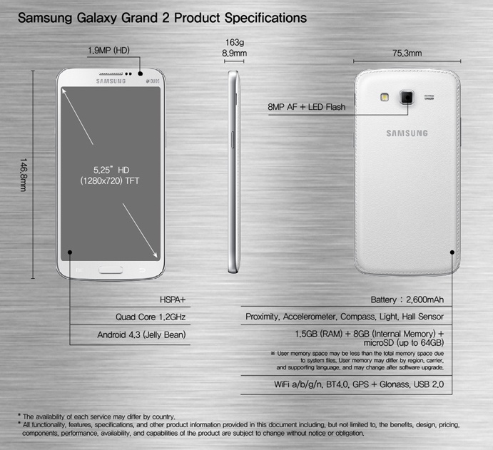 Model này sở hữu bộ vi xử lý lõi tứ tốc độ 1,2 GHz, RAM 1,5 GB và camera sau 8 megapixel. Galaxy Grand 2 có dung lượng lưu trữ trong 8 GB, tích hợp khe cắm thẻ nhớ microSD dung lượng tối đa 64 GB. Những thông số khác về phần cứng của máy bao gồm thiết kế 2 SIM và pin dung lượng 2.600 mAh cho thời gian thoại khoảng 17 tiếng.