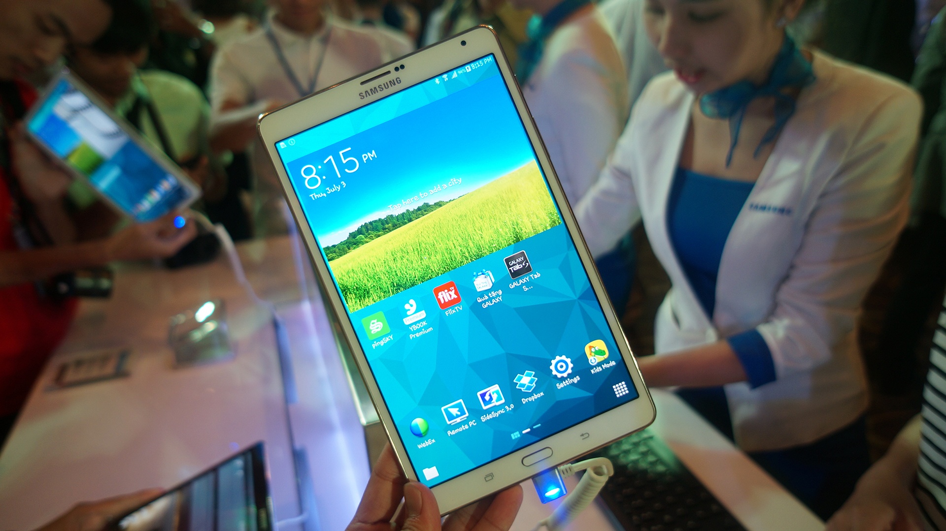 Trong một sự kiện hoành tráng vừa diễn ra tại TP.HCM, Samsung đã trình làng mẫu máy tính bảng mới mang tên Galaxy Tab S, gồm hai phiên bản 8,4 inch và 10,4 inch. Đây là dòng cao cấp mới, chú trọng vào khả năng hiển thị với màn hình Super AMOLED và thiết kế siêu mỏng nhẹ.