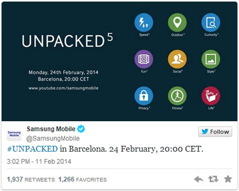 Trên Twitter, tài khoản @samsungmobile cũng đăng tải hình ảnh thư mời về sự kiện Unpack 5 của Samsung, và thông tin đó hoàn toàn phù hợp với những gì mà SamMobile cho biết. Từ những rò rỉ về mẫu smartphone cao cấp mới của Samsung, có thể thấy Galaxy S5 sẽ sở hữu màn hình 5.25-inch AMOLED, to hơn màn hình 5-inch trên người tiền nhiệm Galaxy S4 và có độ phân giải ấn tượng 2.560 x 1.440 pixels. Kích thước của Galaxy S5 là 141.7 x 72.5 x 8.2mm, nhỉnh hơn chút so với Galaxy S4 (136.6 x 69.8 x 7.9mm).