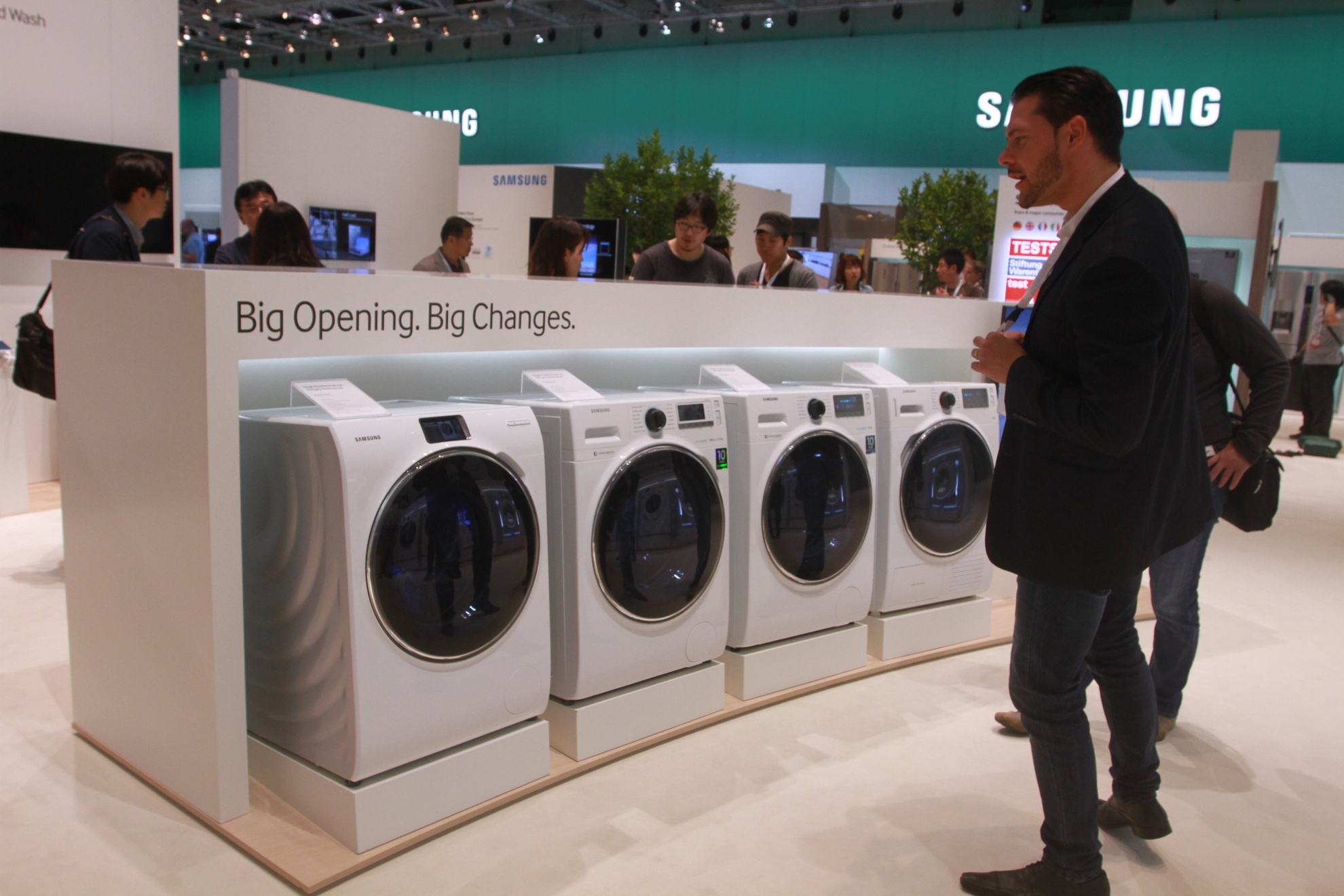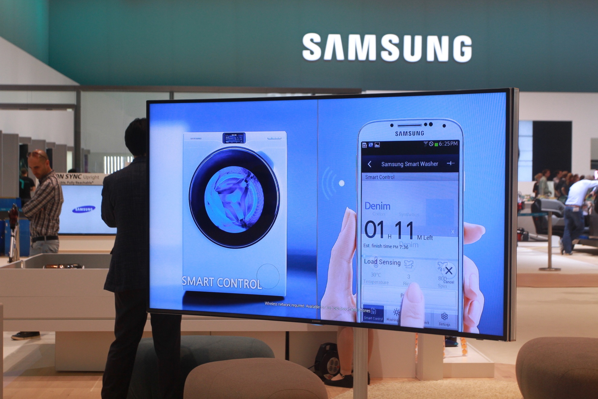 | Trong gian hàng của mình, Samsung đã trình diễn việc điều khiển tủ lạnh, máy giặt và các thiết bị gia dụng khác bằng smartphone. |
