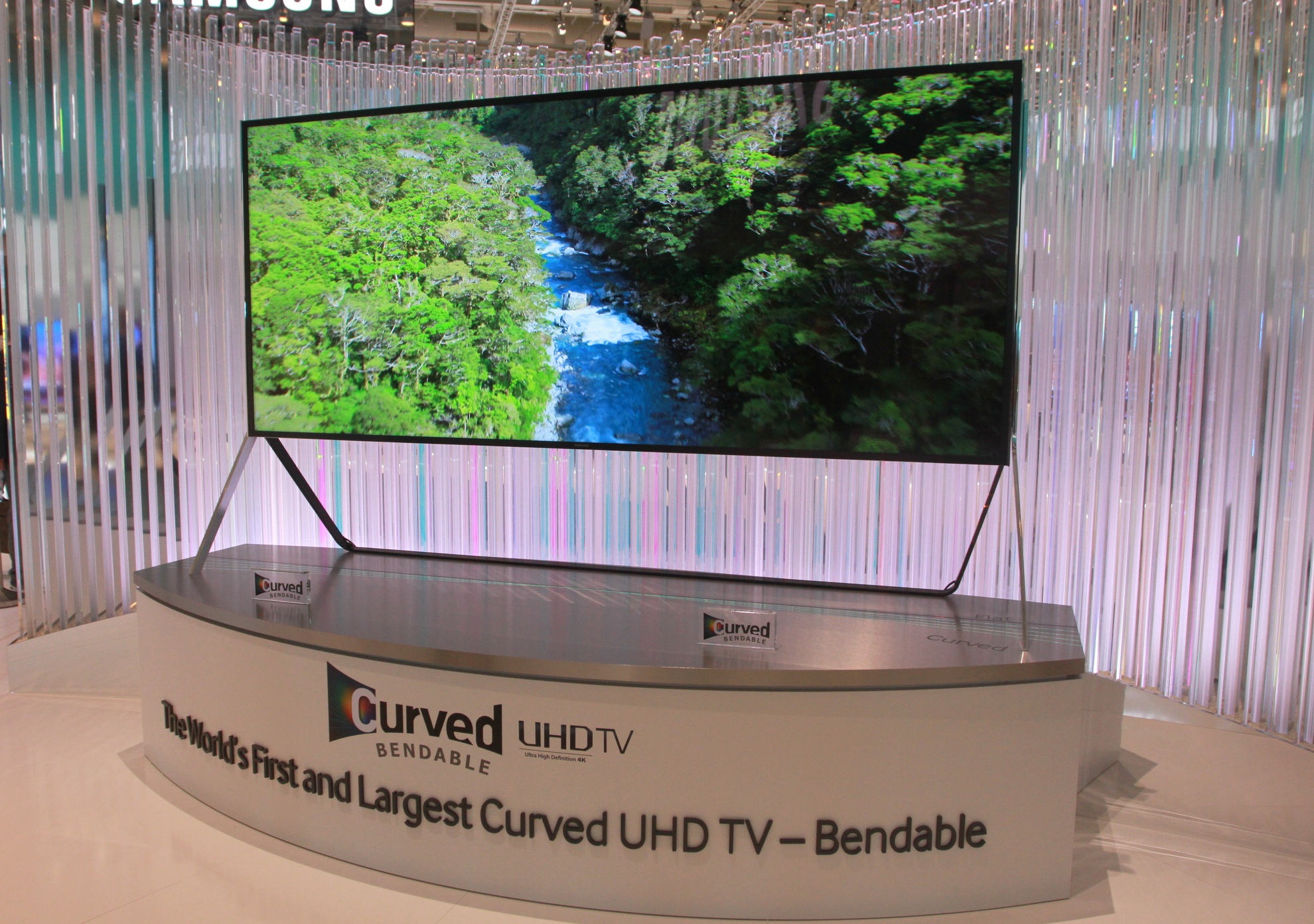 | Bendable UHD TV được đặt tại vị trí trang trọng nhất của sự kiện. Samsung gọi đây là TV UHD màn hình tự bẻ cong lớn nhất và đầu tiên trên thế giới. Trên giá đỡ, chiếc TV liên tục phô diễn khả năng của mình bằng cách uốn màn hình cong mạnh. |