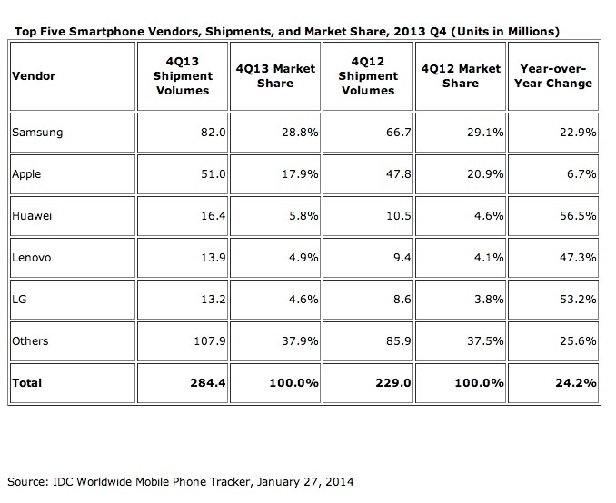 Trong quý cuối cùng của năm 2013, Apple đã thiết lập một kỷ lục mới với 51 triệu iPhone được bán ra. Samsung tiếp tục giữ vững ngôi đầu với 82 triệu thiết bị được tung ra thị trường.