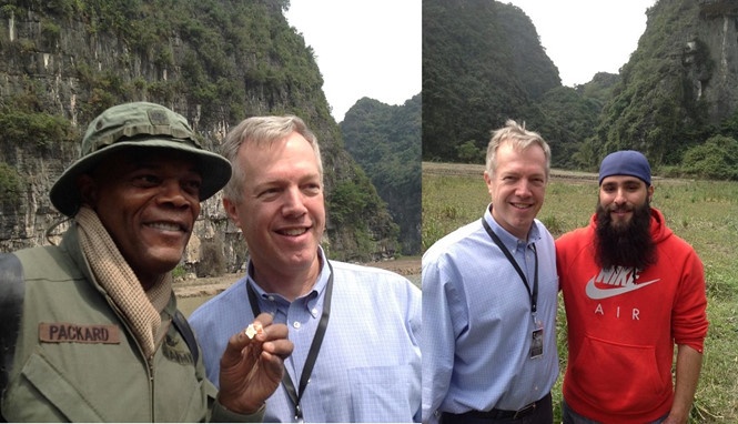| Samuel L.Jackson và đạo diễn phim (áo đỏ) chụp ảnh cùng Đại sứ Mỹ tại Việt Nam. Ảnh: Facebook Ted Osius. |