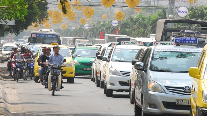 | Ôtô nối đuôi nhau trên đường Trường Sơn ra vào sân bay Tân Sơn Nhất. |