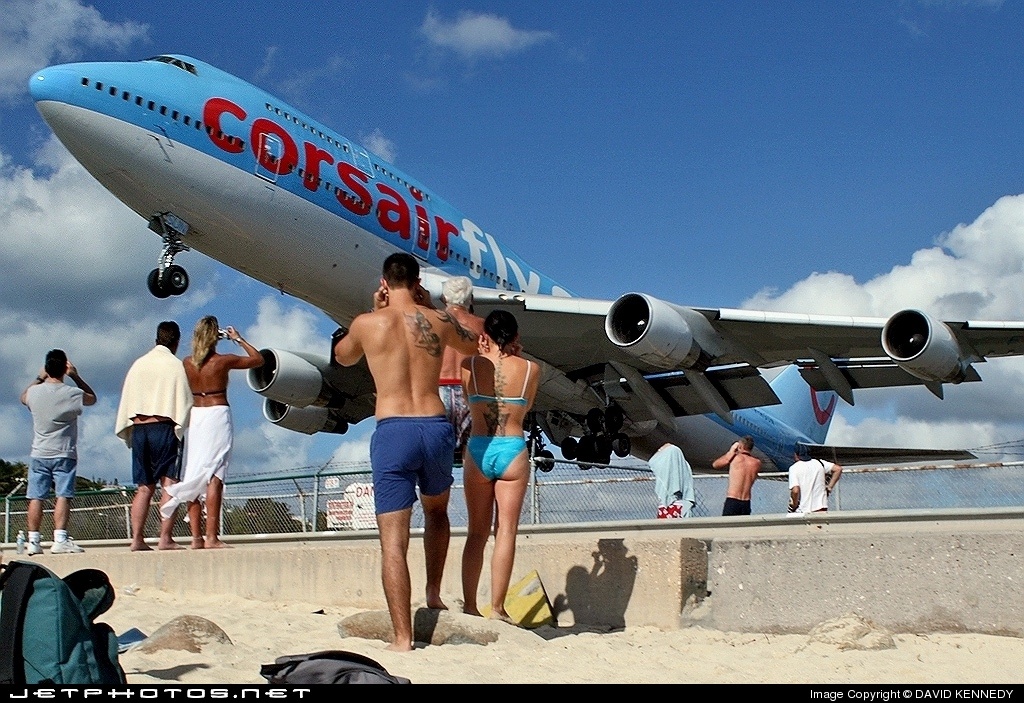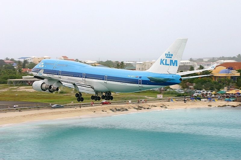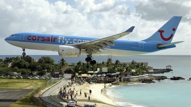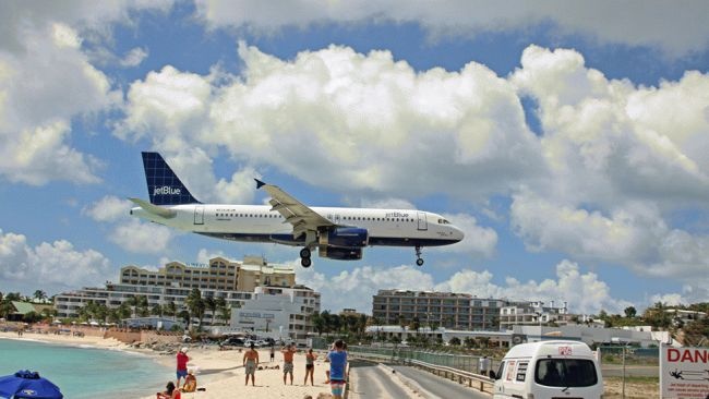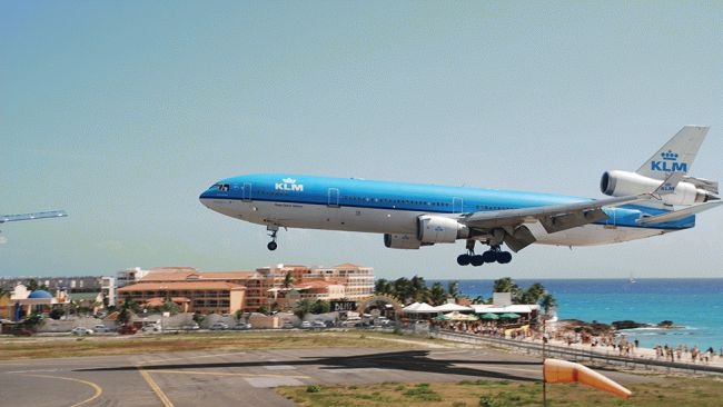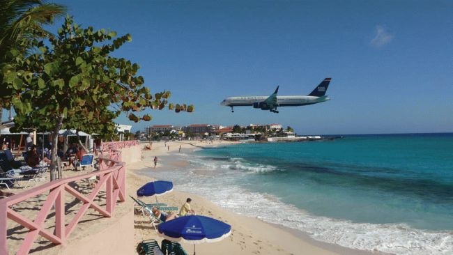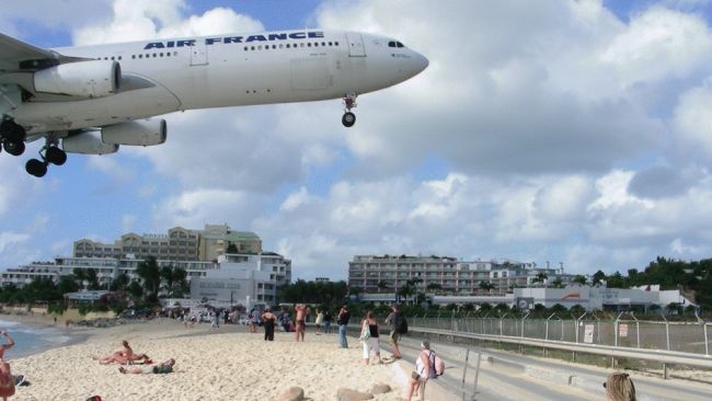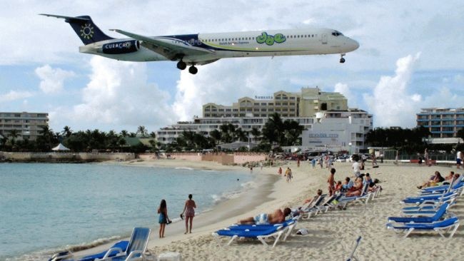 | Do địa hình gồ ghề, người ta buộc phải xây dựng sân bay quốc tế Princess Juliana nằm sát bãi biển Maho, nơi hàng ngàn du khách tới tắm mỗi ngày. Đường băng ngắn, các máy bay buộc phải hạ độ cao xuống mức thấp nhất có thể để tiếp đất từ đầu đường băng, tránh vọt khỏi phi trường. Ảnh: weather.com. |