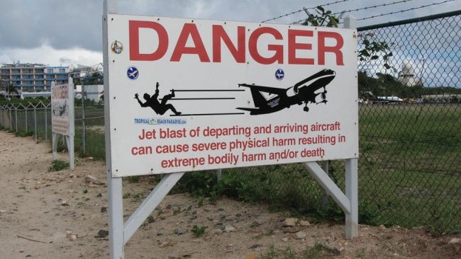 Người ta đặt rất nhiều biển cảnh báo nguy hiểm để du khách tránh xa rào ngăn đường băng khi có máy bay cất và hạ cánh. Nội dung biển cảnh báo nói rõ: "Hành khách có thể bị thương, thậm chí nguy hiểm tới tính mạng do khí thải động cơ phản lực lúc máy bay cất và hạ cánh". Ảnh: weather.com.