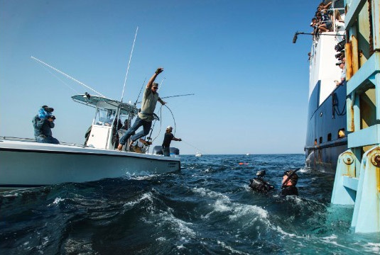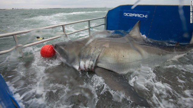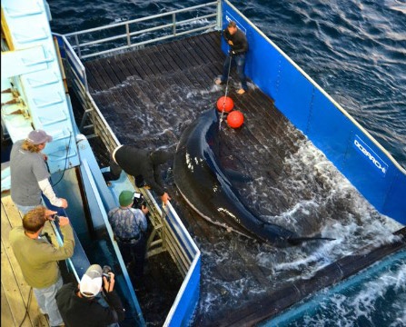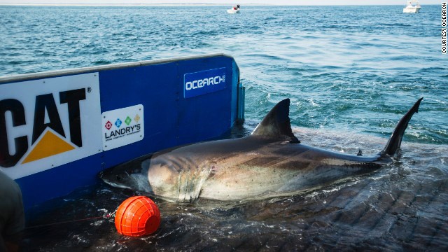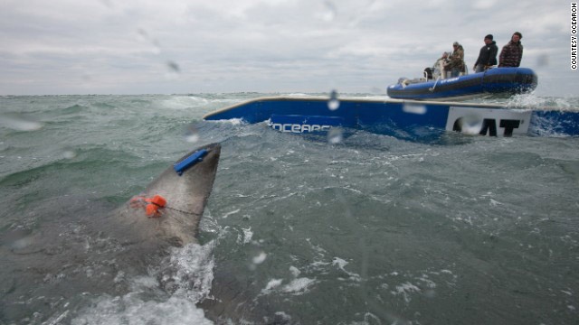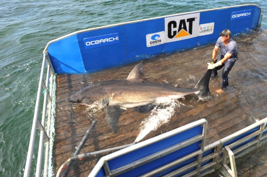 Các nhà nghiên cứu phải lao mình xuống nước để lùa những con cá mập trắng khổng lồ vào thiết bị chuyên dụng. Thống kê năm 2013 cho thấy, cá mập gây ra 72 vụ tấn công người toàn thế giới, giết 10 người. Nó cho thấy nguy cơ chết vì cá mập thấp hơn rất nhiều so với khả năng chết vì tai nạn giao thông.