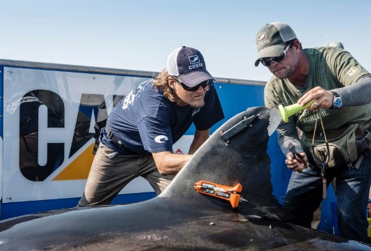Sau khi đưa được những con cá mập lên khỏi mặt nước, các nhà nghiên cứu sẽ sử dụng những thiết bị chuyên dụng để gắn lên vây lưng con cá. Mỗi chíp này có khả năng hoạt động liên tục trong 5 năm.