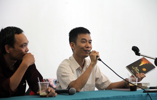| Tác giả Đặng Thiều Quang (bên phải) trong buổi họp báo ra mắt sách. |
