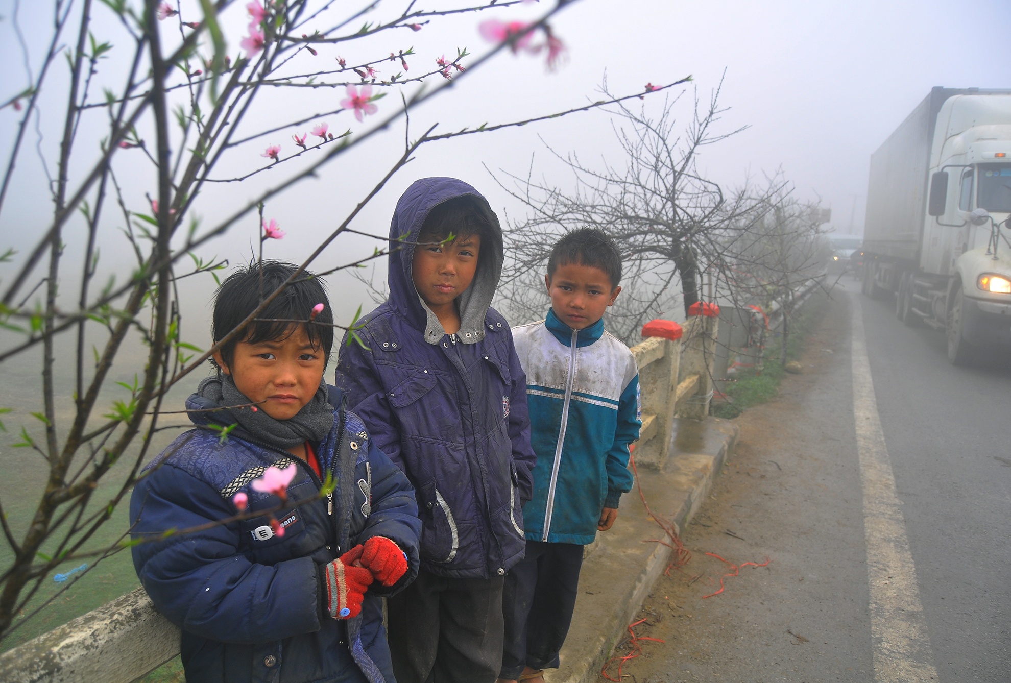 Không chỉ có người lớn, trẻ em các bản tại đây cũng tự chặt cành đào trong vườn mang đi bán. Em Giàng A Sự (5 tuổi, trái), trú bản Sâu Chua, xã Sa Pả cùng anh trai Giàng A Lờ (giữa ảnh) tự chặt và vác 2 cành đào nhỏ đã nở hoa ra đứng bán trên cầu. Bên cạnh là từng đoàn container, xe tải, xe khách lao nhanh qua. Sự cho biết, em cùng anh bán đào để lấy tiền mua đồ chơi trong những ngày không phải lên lớp.