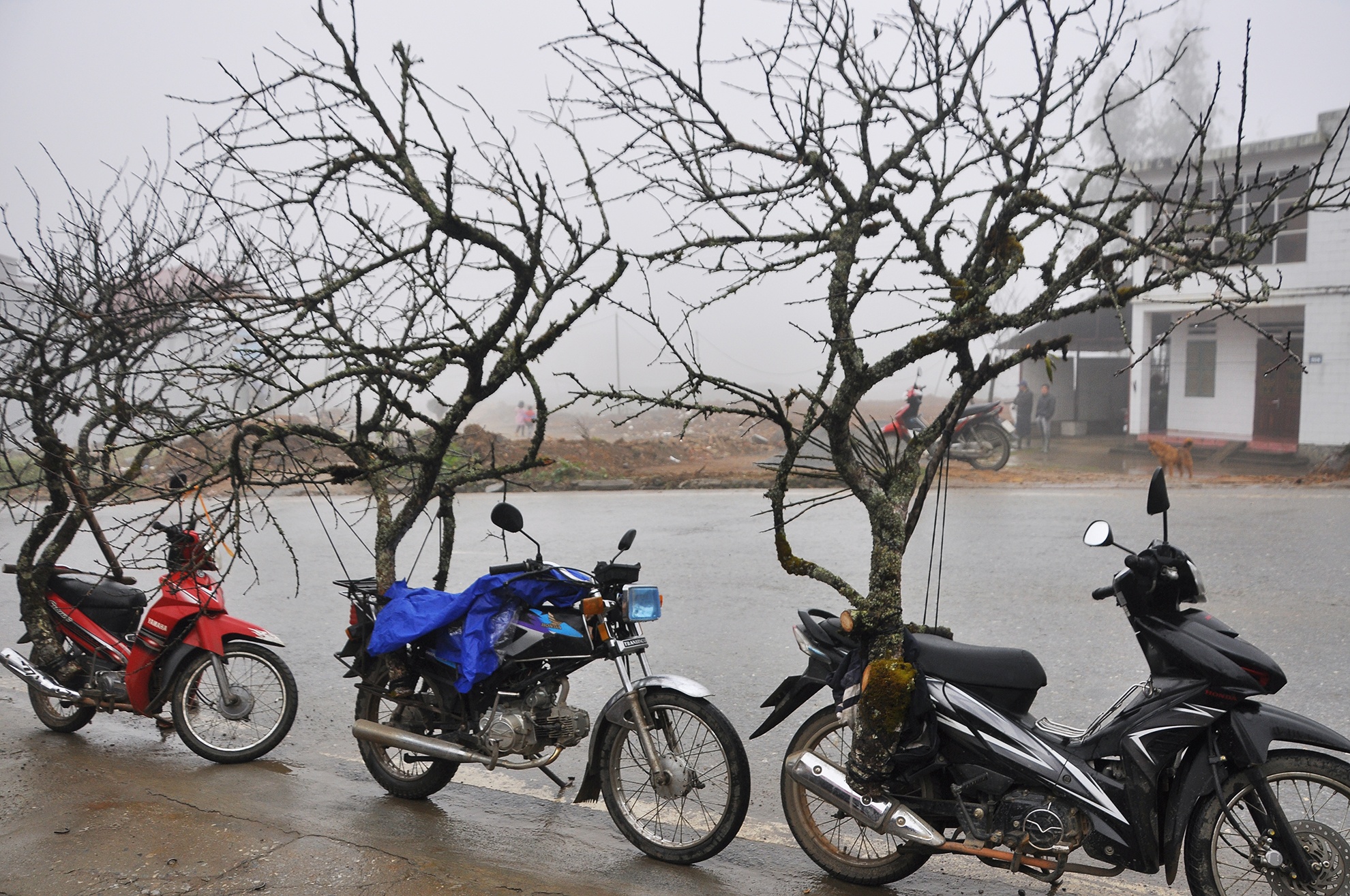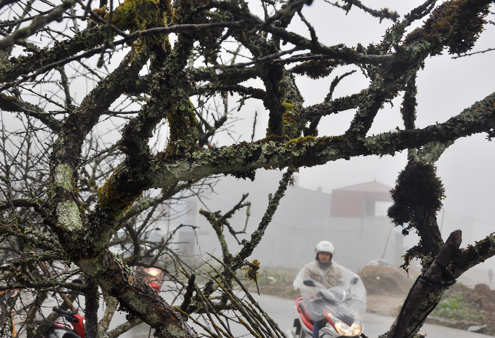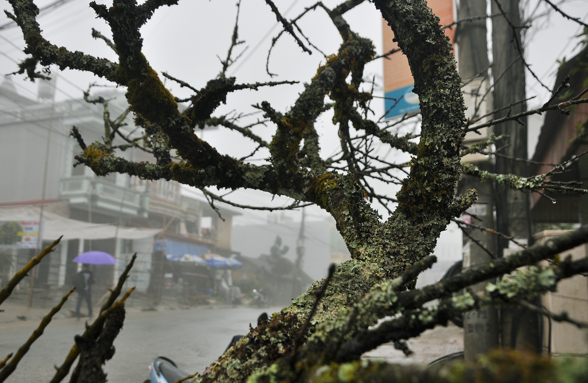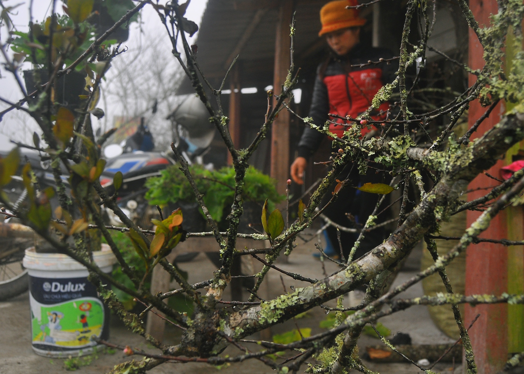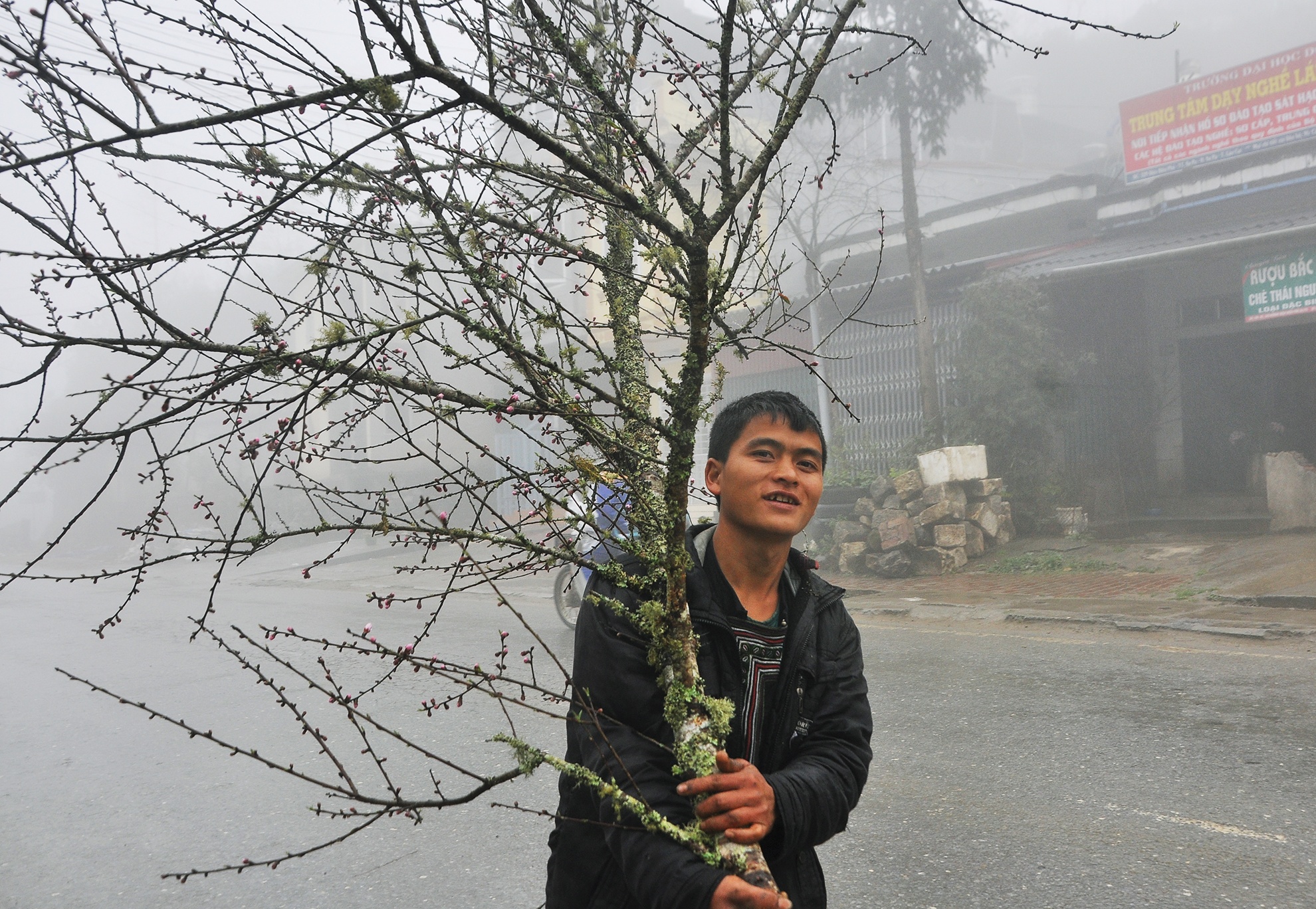 Anh Giàng A Páo (23 tuổi, người H'Mông) đầu trần, đi dép lê trong cái lạnh 5-6 độ vác cành đào đầy rêu mốc xuống chợ. Anh Páo cho biết, nếu bán được cành hoa này anh sẽ về chặt nốt cành còn lại để bán lấy tiền mua quần áo cho con gái.