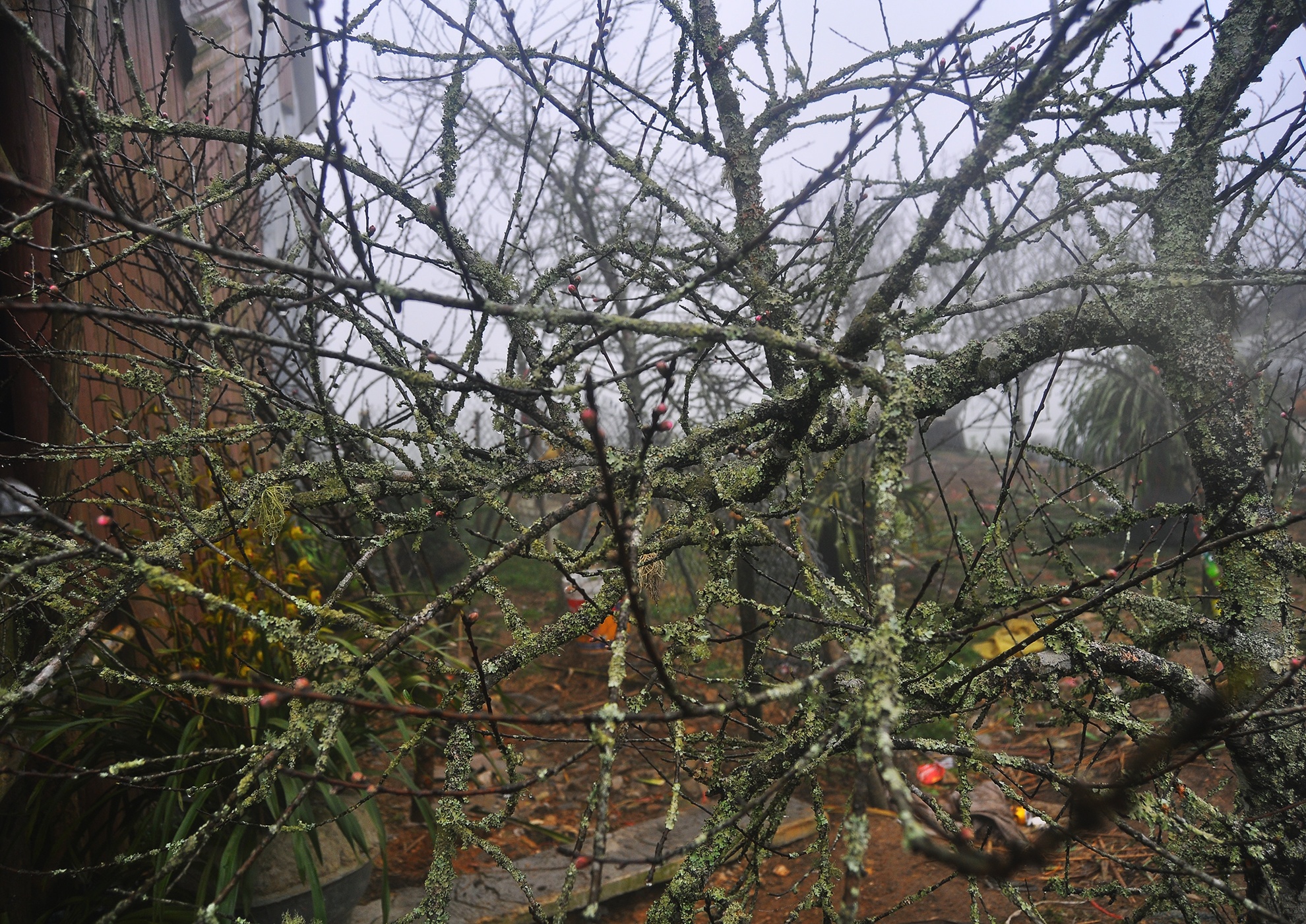 Bình thường, rêu mốc màu xanh bám kín vỏ, thân cây trông như củi khô. Nhưng khi hoa nở, cây đào như lột xác với đầy đủ màu sắc và vẻ đẹp phong sương.