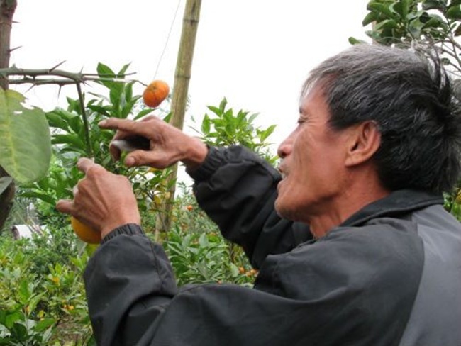| Ông Giáp đang chăm sóc cho vườn cây ngũ quả chuẩn bị dịp Tết. |