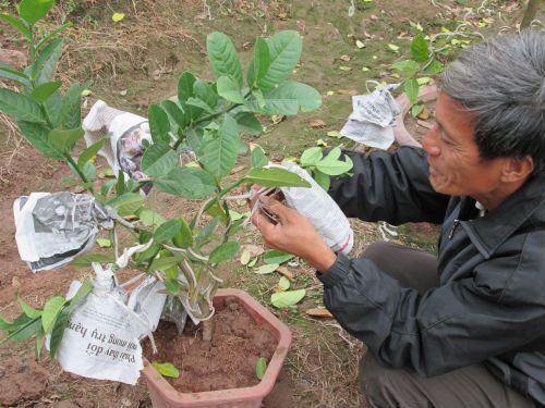 | Để cây trông đẹp mắt, ông đã ghép thêm nhiều loại quả vào. Quả mới ghép sẽ được bọc báo để tránh ánh nắng chiếu vào. Sau một tuần có thể tháo lớp báo này đi. |