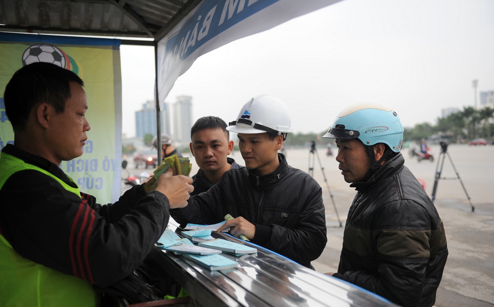 | Phe vé cũng bắt đầu xuất hiện ở các quầy bán quanh SVĐ Mỹ Đình, họ mua với số lượng hàng chục vé mỗi lượt để "đầu cơ". |