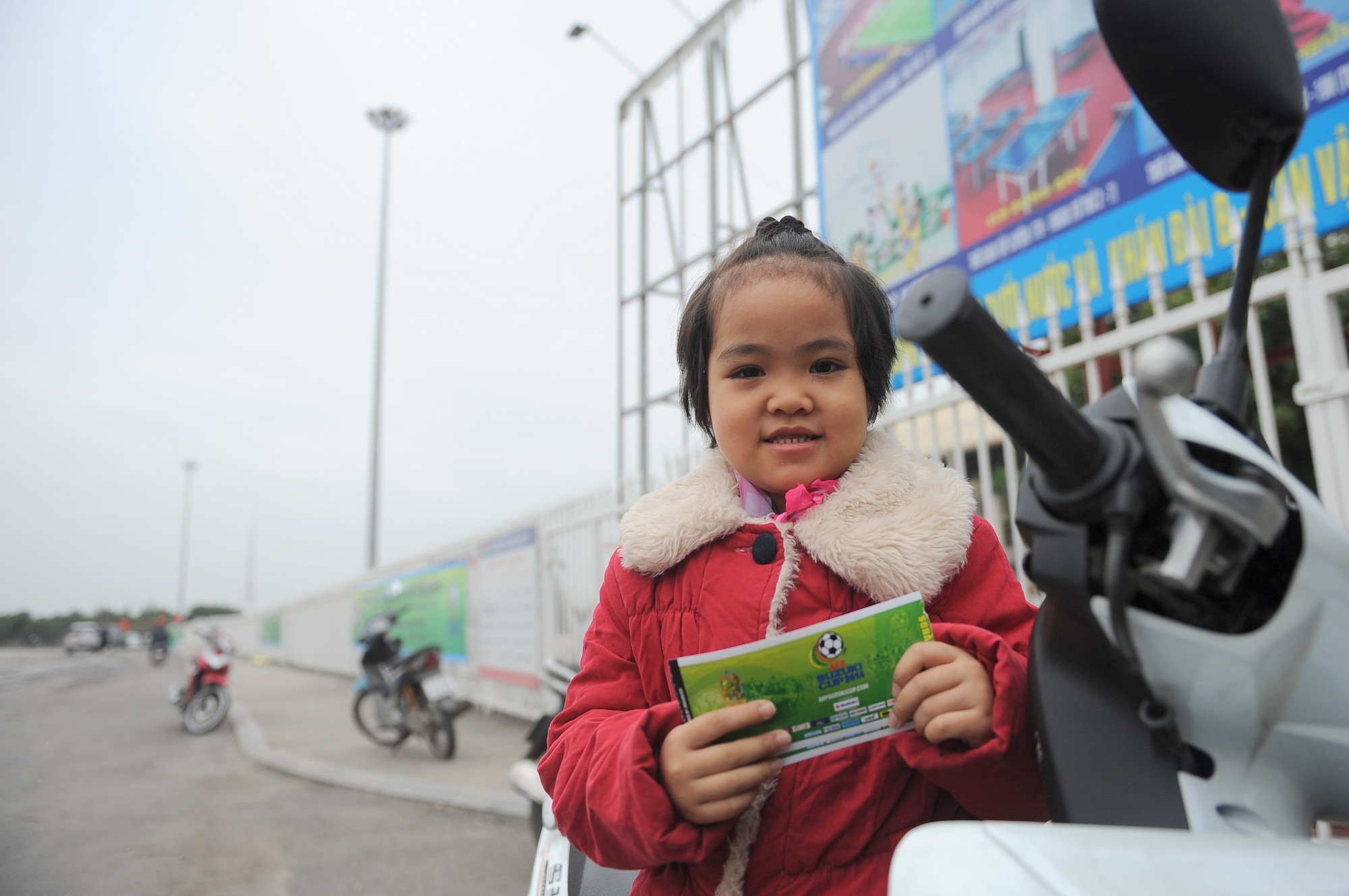 | Bé Thanh Mai năm nay 6 tuổi, nhà ở bán đảo Linh Đàm đã phấn đấu đạt điểm 10 môn Toán để nhận được phần thưởng cùng mẹ tới SVĐ Mỹ Đình mua những chiếc vé đầu tiên xem ĐTVN thi đấu tại AFF Cup 2014. |