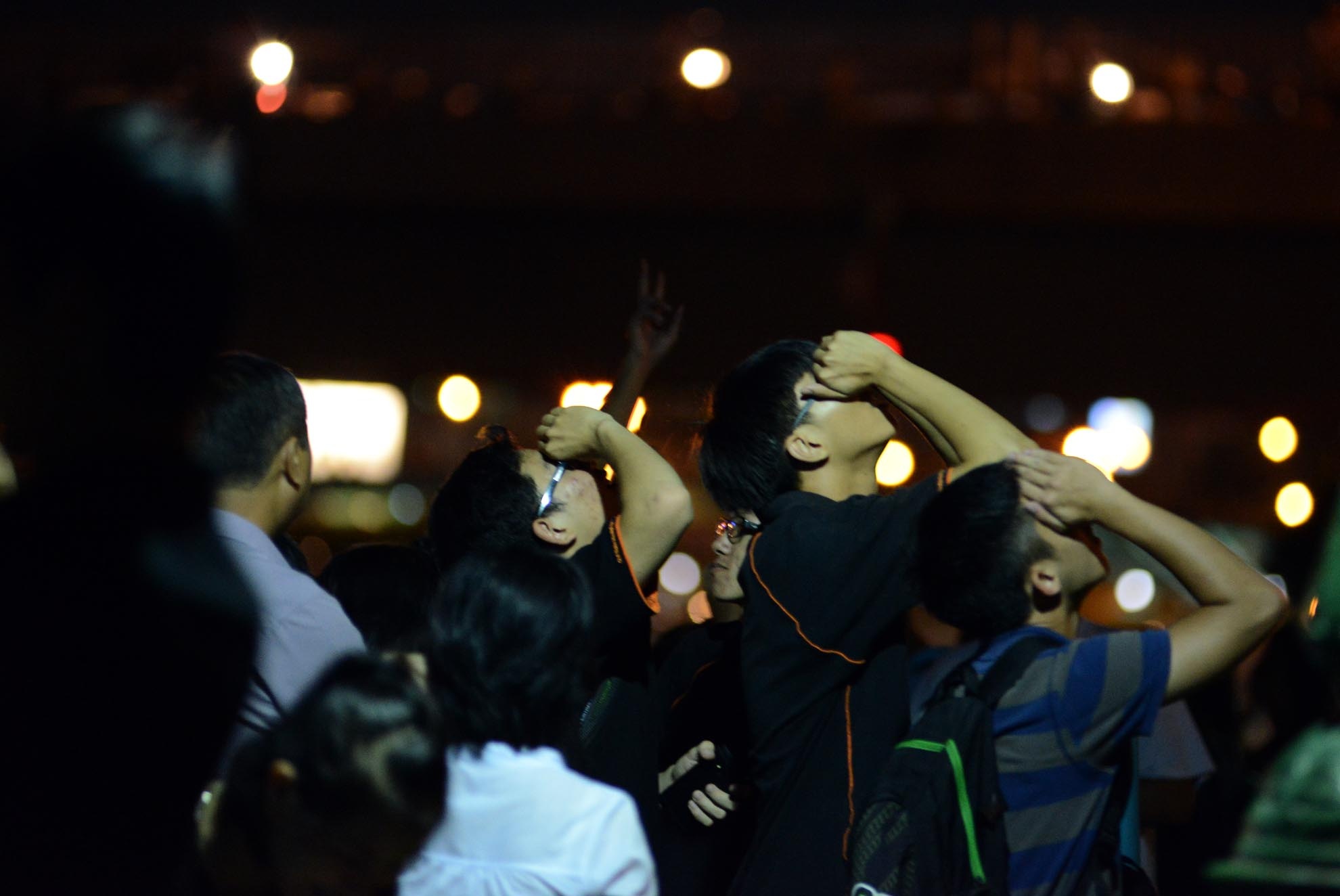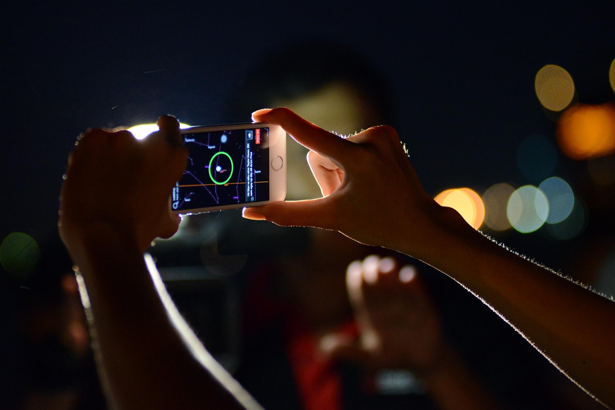 | Tới hơn 7h, mặt trăng đã lên cao nhưng bị mây che nên không thể quan sát qua kính viễn vọng. Nhiều bạn trẻ phải dùng điện thoại để định vị mặt trăng phía sau đám mây dày đặc. |