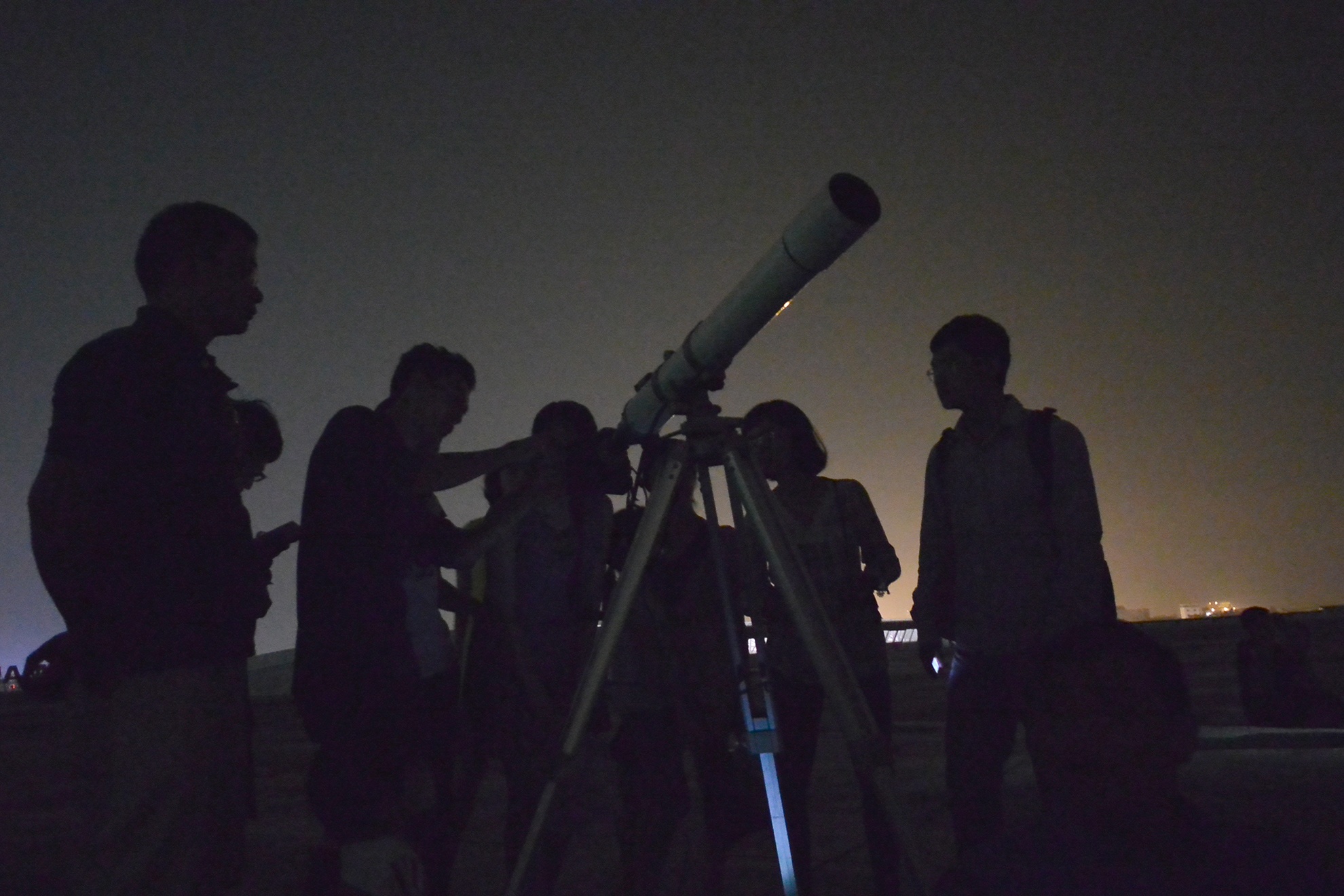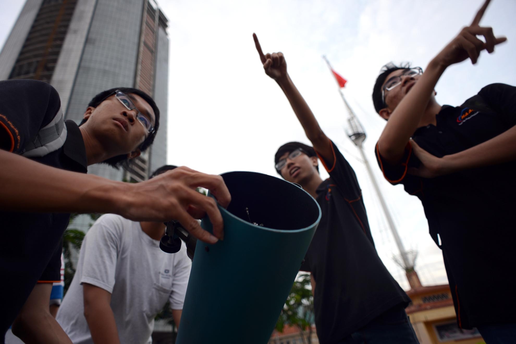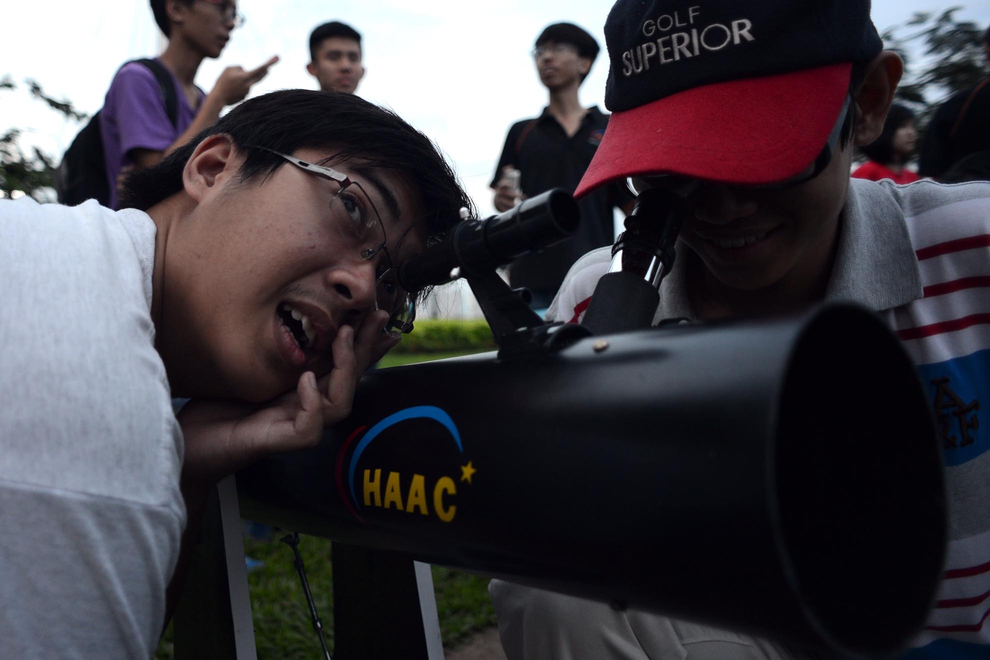 | Những bạn trẻ này thay nhau quan sát hiện tượng thiên văn kỳ thú qua kính viễn vọng. |