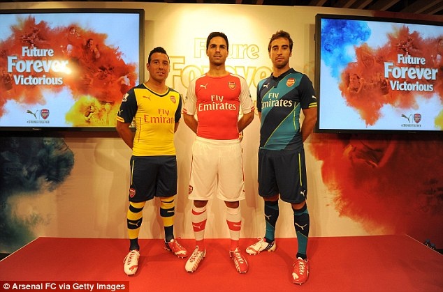 | Santi Cazorla, Mikel Arteta và Mathieu Flamini trong buổi ra mắt áo đấu của Arsenal mùa tới do Puma tài trợ. |