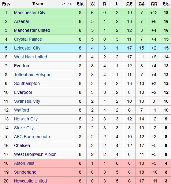 | Bảng xếp hạng Premier League sau vòng 8. Man City trở lại ngôi đầu với 18 điểm, trong khi Arsenal vượt mặt MU để leo lên vị trí thứ hai sau chiến thắng 3-0 trước đội bóng này trên sân nhà Emirates. |