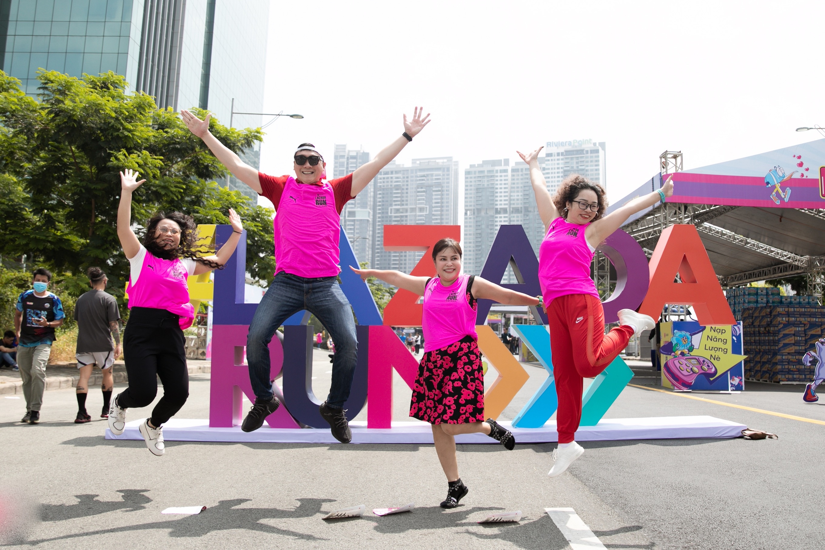 | Nhiều runner rủ nhau check-in các khu vực trò chơi tại sự kiện với áo đấu rực rỡ. |