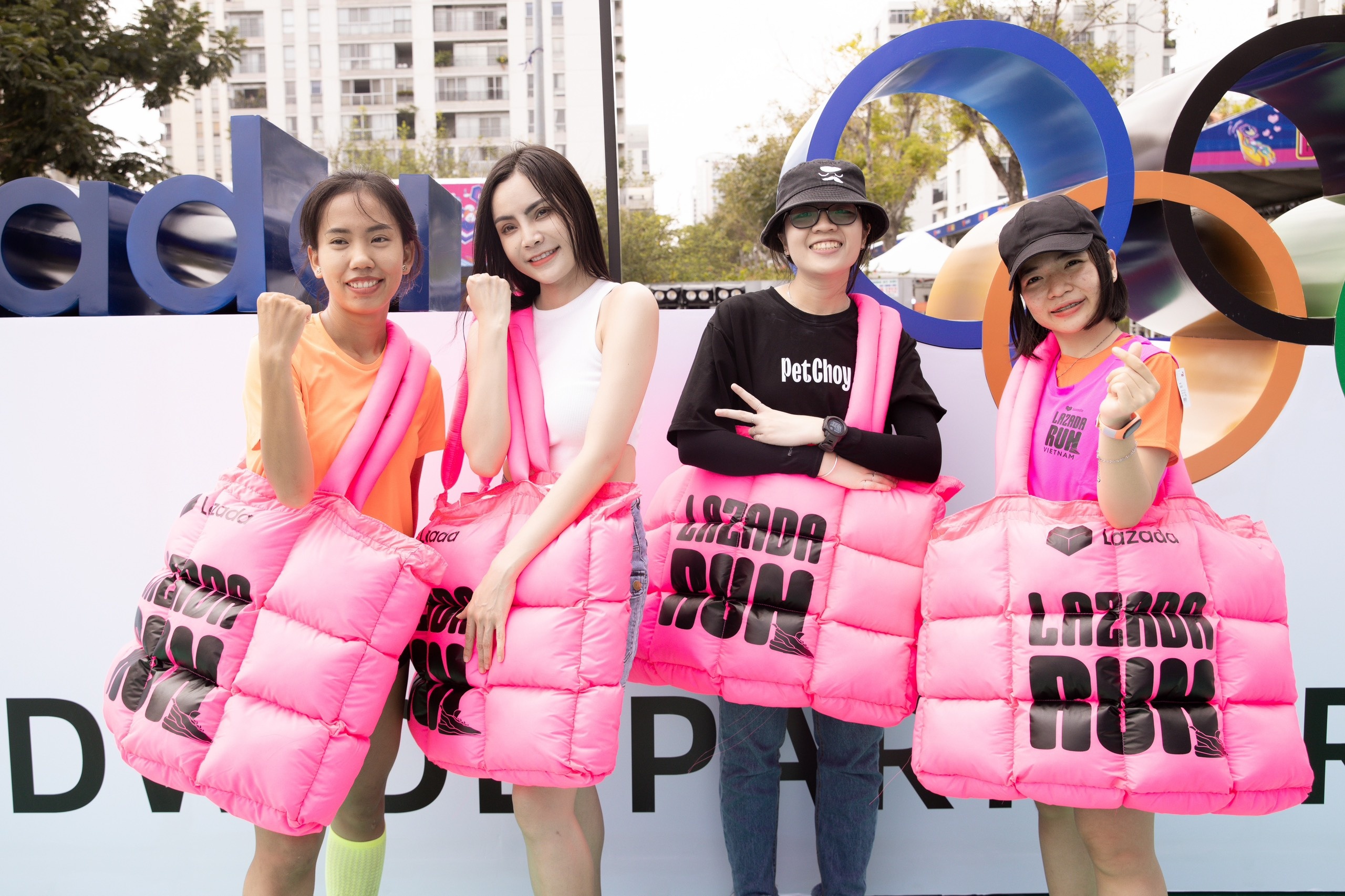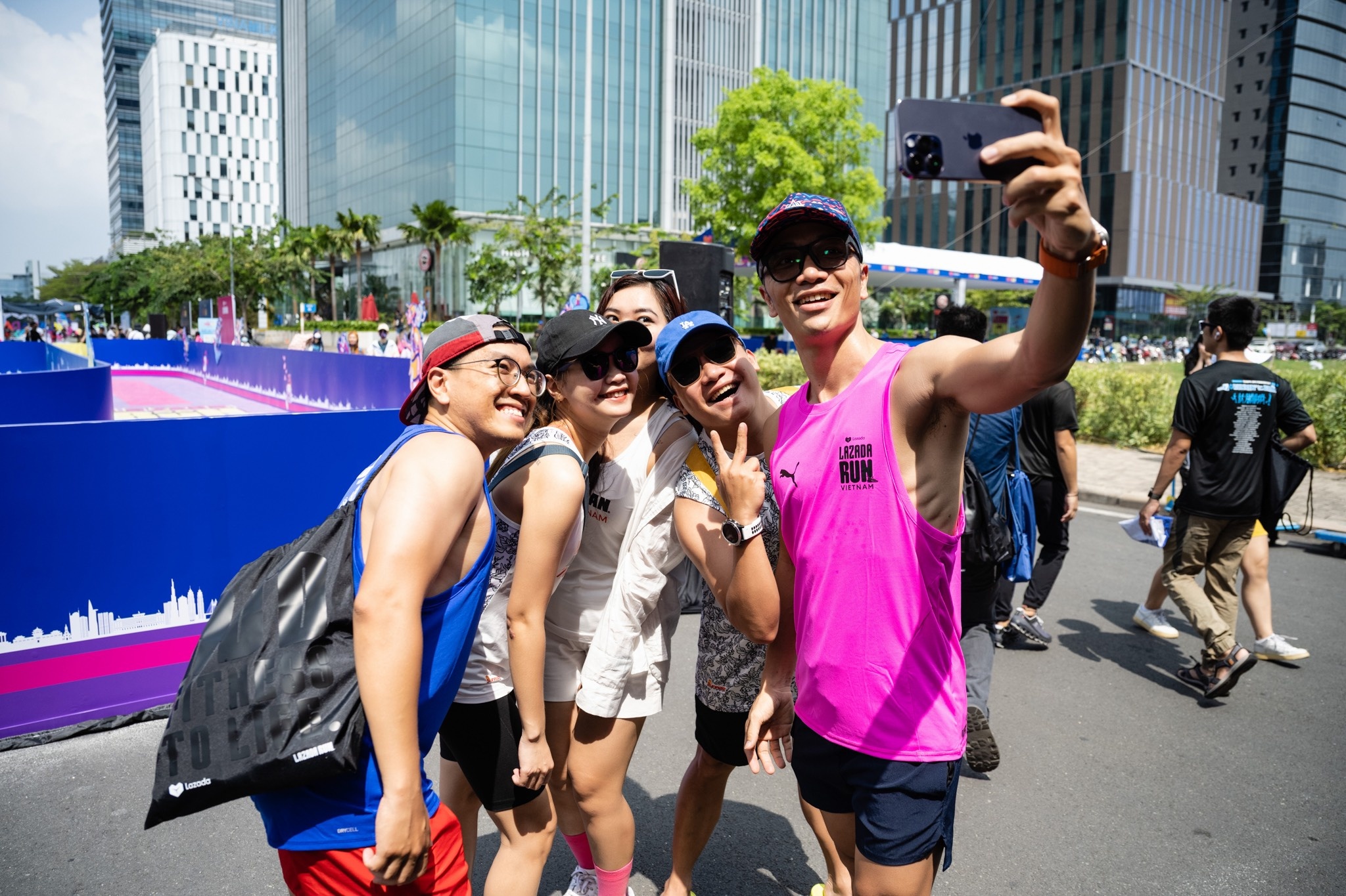 Trên tay áo đấu từ nhà tài trợ trang phục độc quyền PUMA và túi dây rút màu sắc, các runner vui vẻ check-in, chia sẻ khoảnh khắc lên mạng xã hội. Một số người cho biết mình khách hàng quen, thường xuyên mua sắm trên sàn TMĐT Lazada.