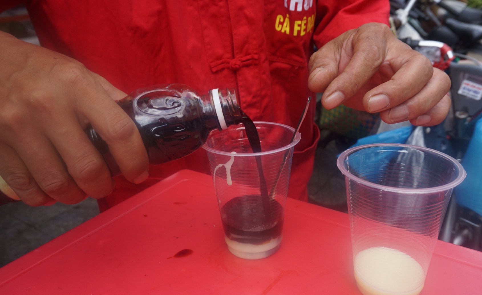 | Cà phê được người bán nhập từ các đầu mối buôn là cà phê pha sẵn, đặc sánh đựng trong chai lớn sau đó pha loãng bán lẻ cho khách với giá 10.000 đồng/ly. Ảnh: Diệp Sa. |