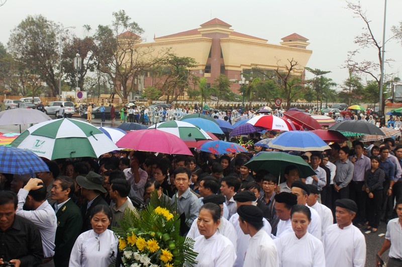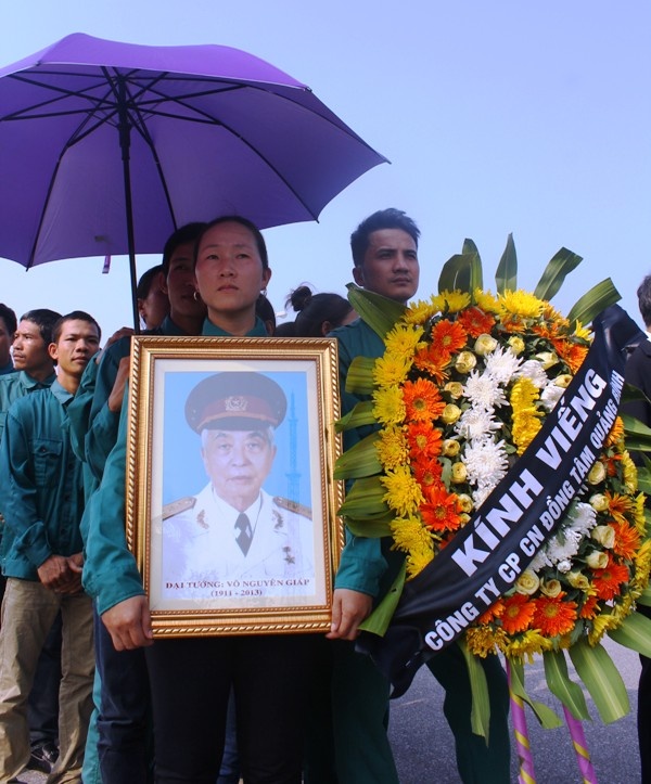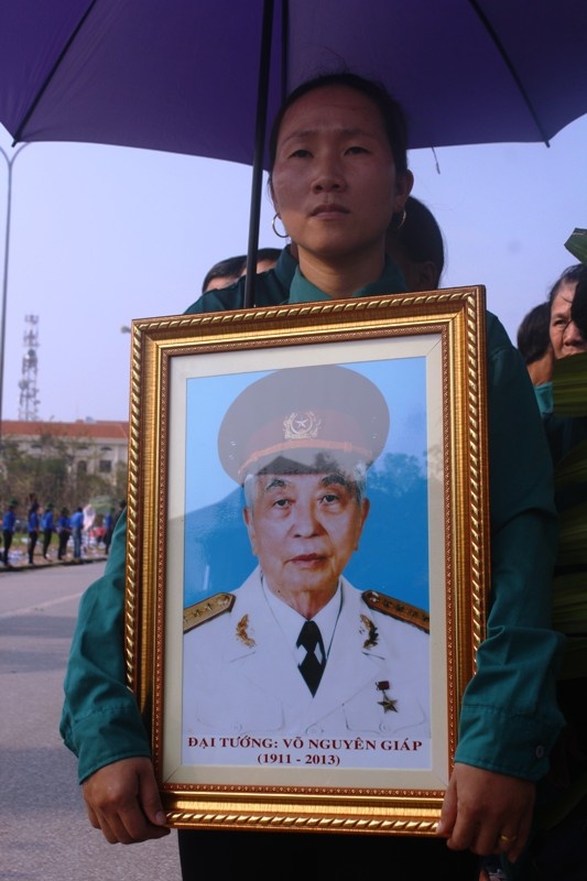 Sau đó trời rất mưa to nhưng hàng ngàn người vẫn đội mưa chờ viếng Đại tướng Võ Nguyên Giáp, người con của quê hương Quảng Bình.